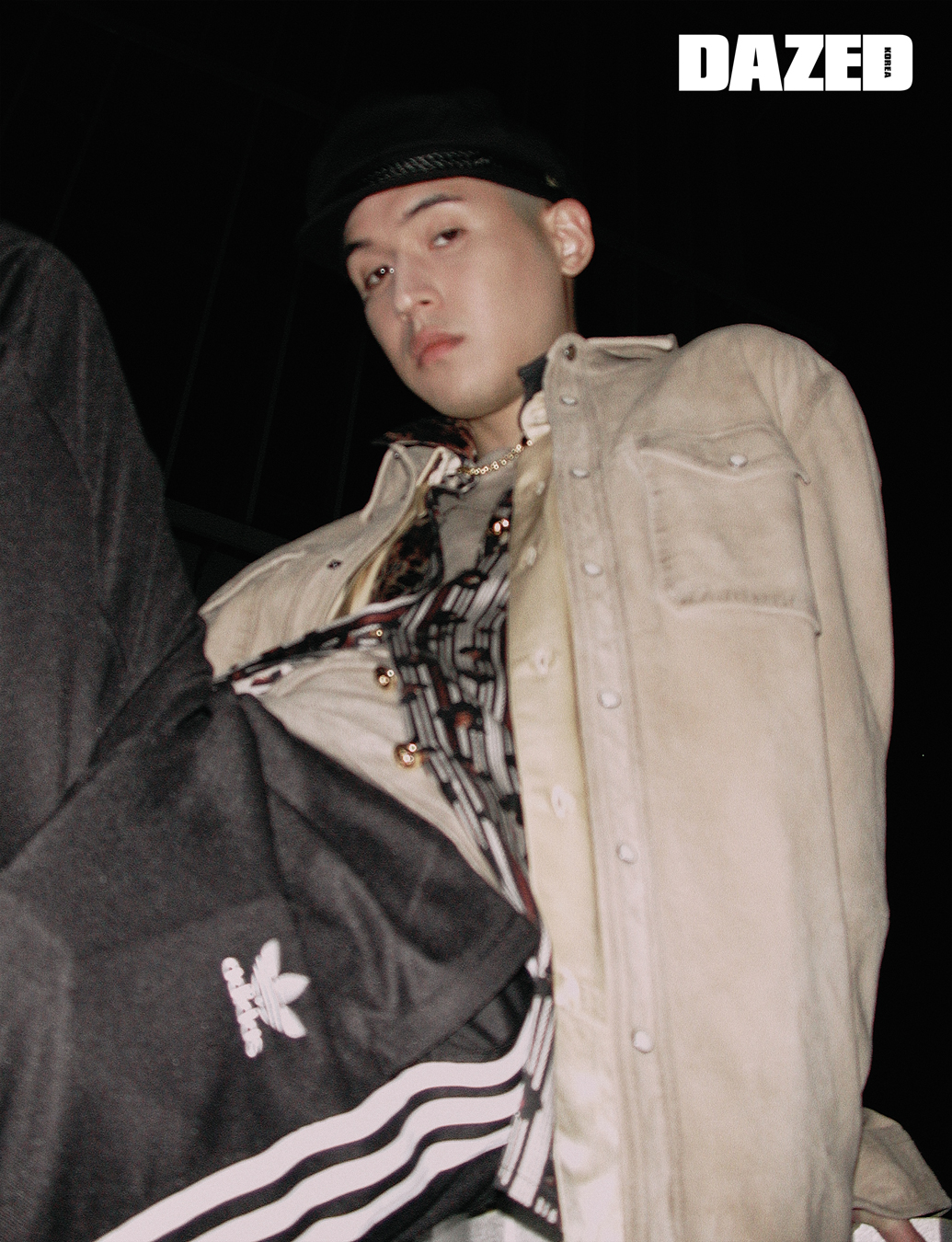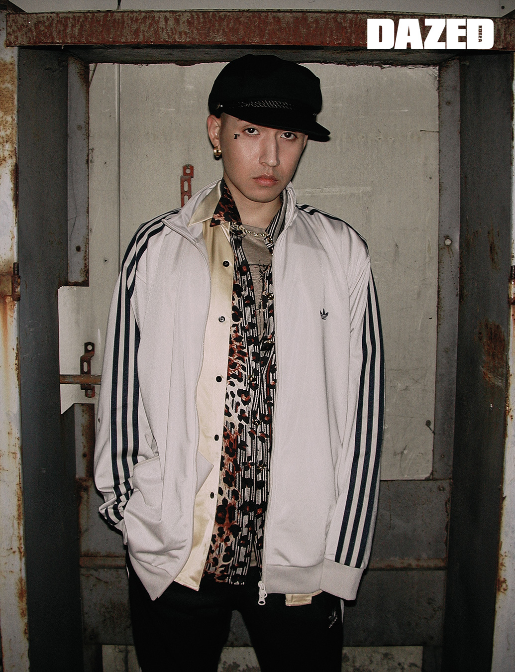 패널 디테일의 트랙 집업과 팬츠는 어니스트 W. 베이커(Ernest W. Baker), 레이어링한 재킷은 존 바바토스(John Varvatos), 버튼 장식 톱과 티셔츠는 아디다스 오리지널스(adidas Originals), 로고 디테일 삭스는 보스(Boss), 딥 브라운 컬러 로퍼는 토즈(Tod’s), 이어링은 톰 우드(Tom Wood), 링은 불레또(Bulletto).