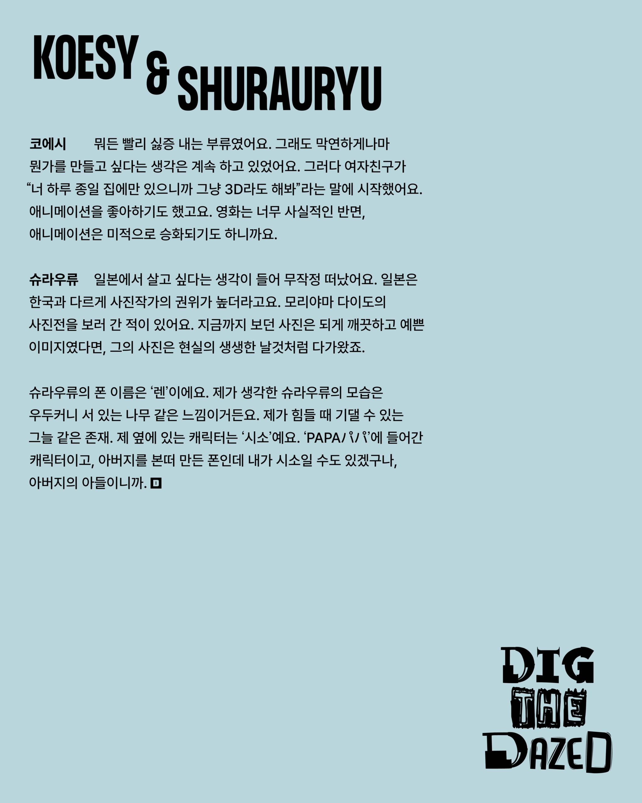 허구의 환상을 포착하는 것은 우리의 마음속을 세상 밖으로 꺼내는 작업일지 모른다. 코에시의 환상과 슈라우류의 현실이 더해졌을 때, 디지털과 아날로그가 한데 뒤섞이는 순간.