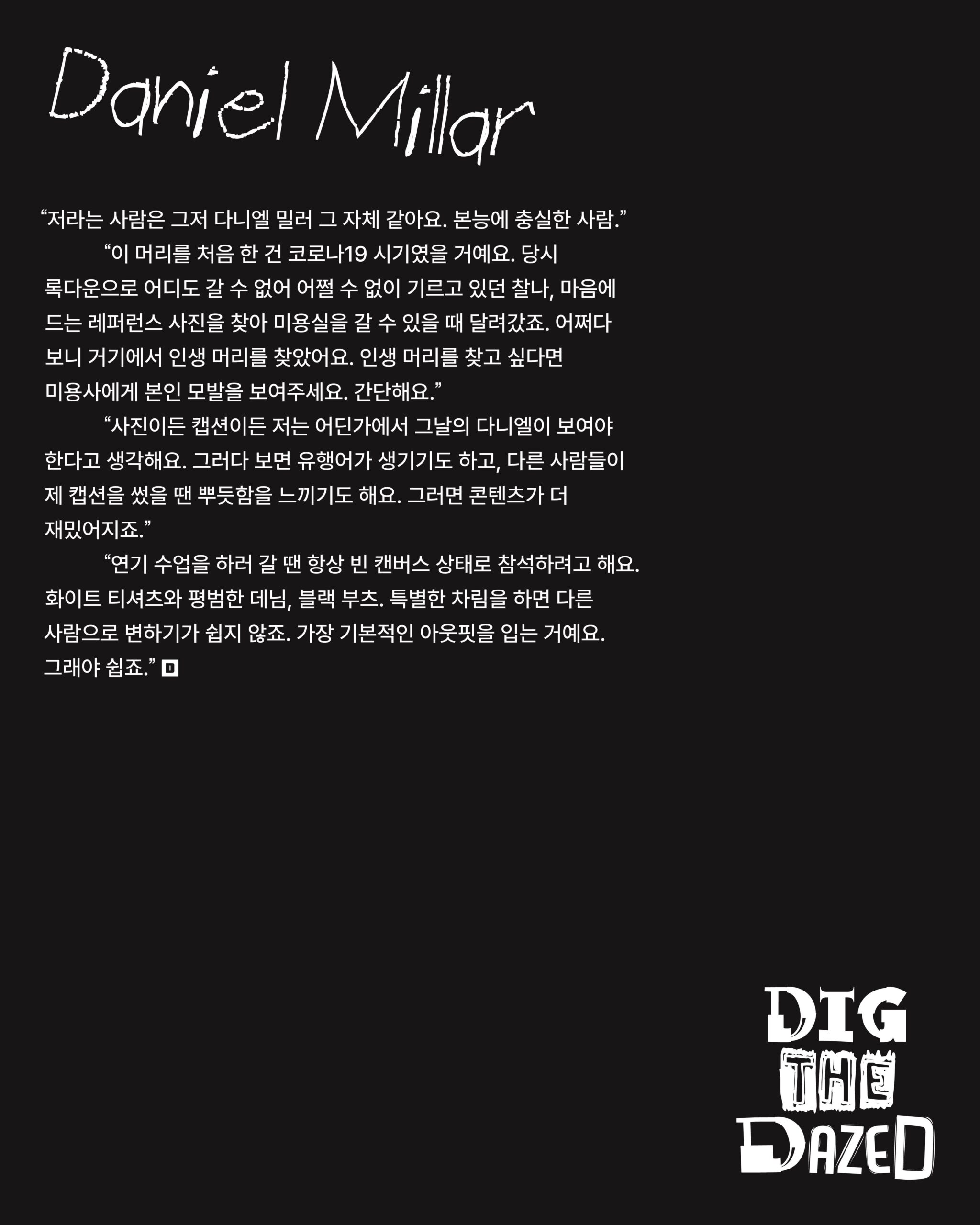 “사진이든 캡션이든 저는 어딘가에서 그날의 다니엘이 보여야한다고 생각해요.” 강아지 같은 곱슬머리 헤어스타일로 인기를 얻은 모델이자 배우인 다니엘 밀러.