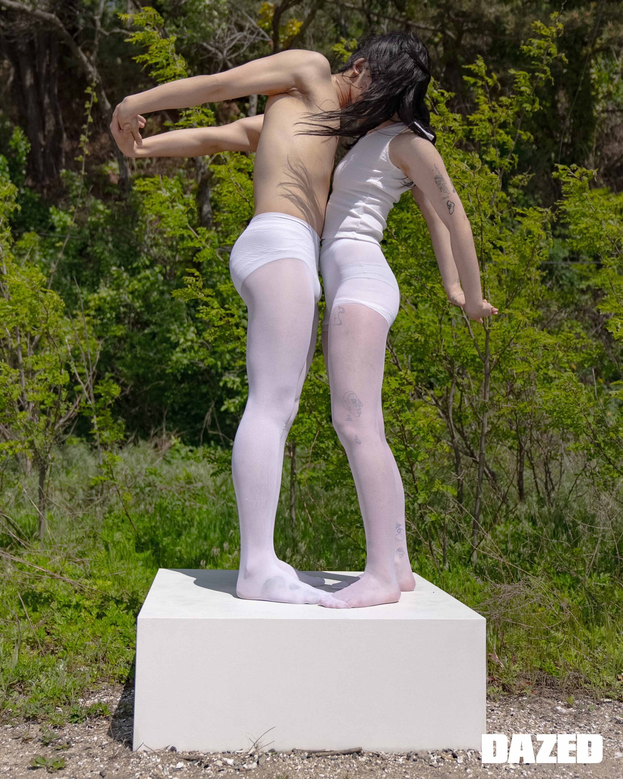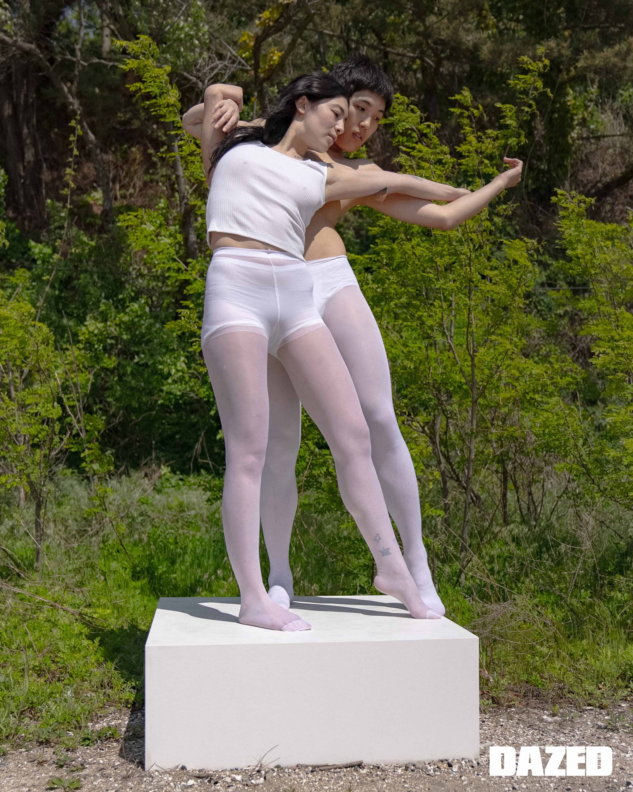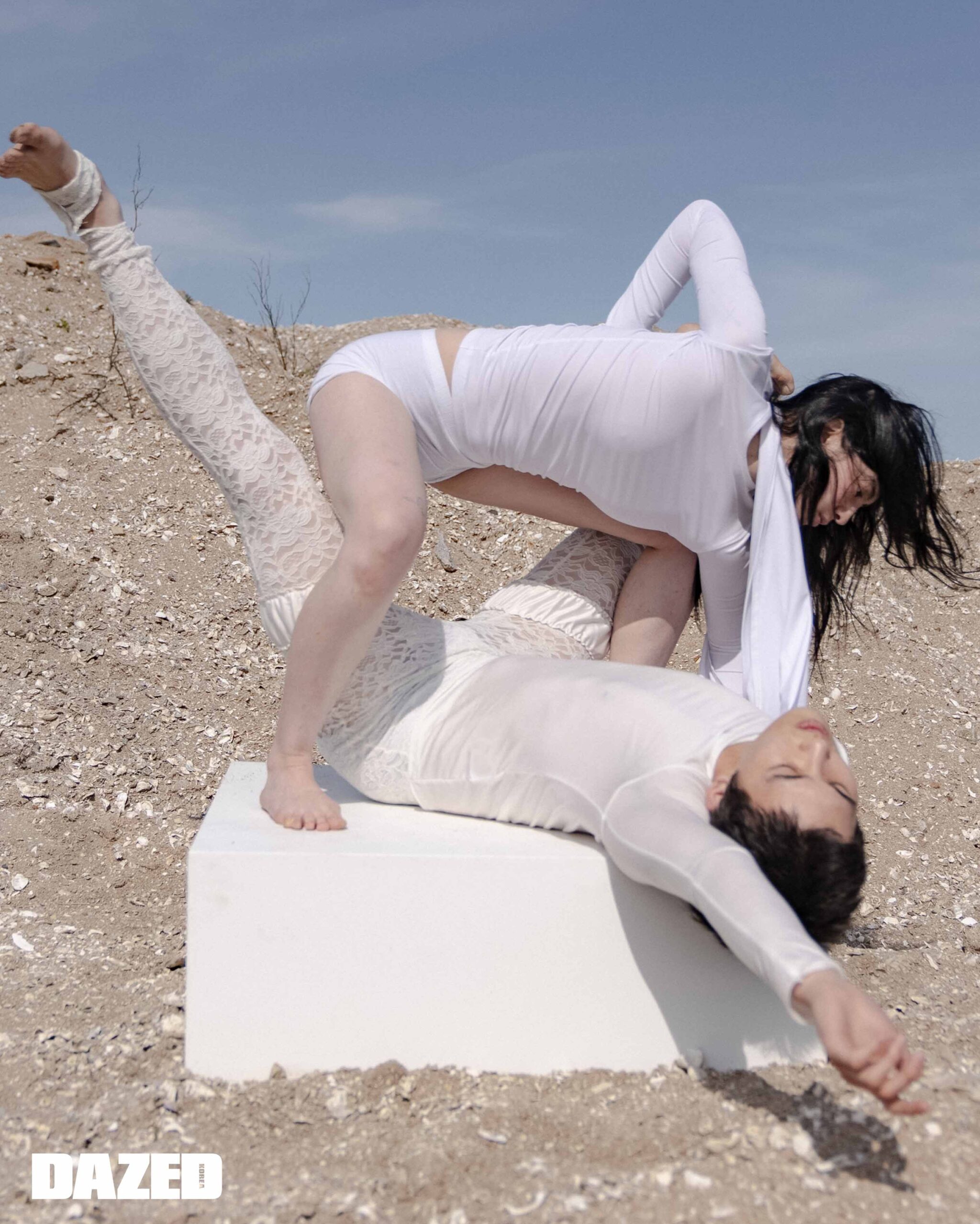 나오미가 입은 원 버튼 레이어드 티셔츠는 아드베스(Arts De Base), 드로즈는 에디터의 것. 준훈이 입은 롱 슬리브 티셔츠는 메종 마레(Masion Marais), 레이스 타이츠는 2000아카이브스(2000Archives), 브리프는 에디터의 것.