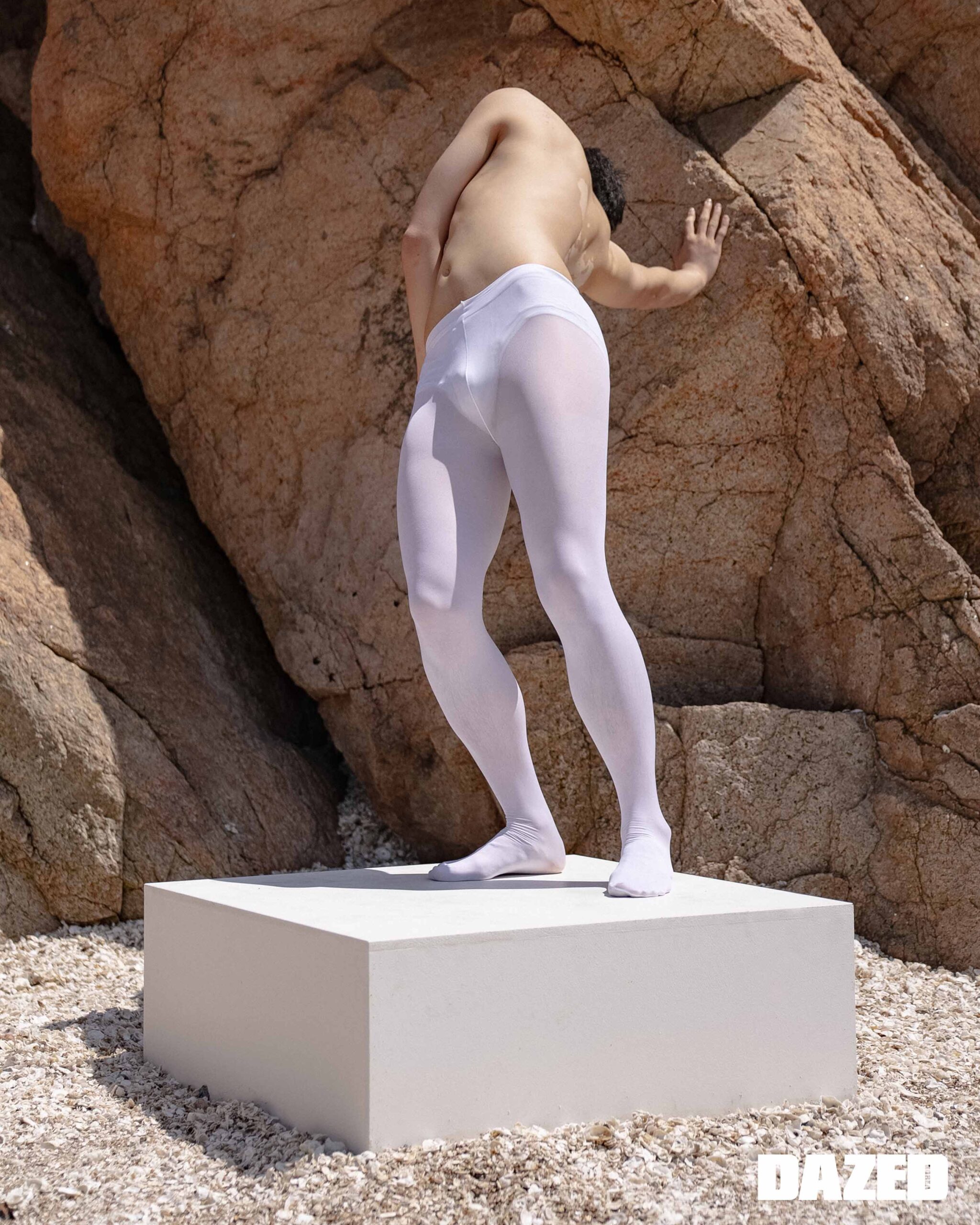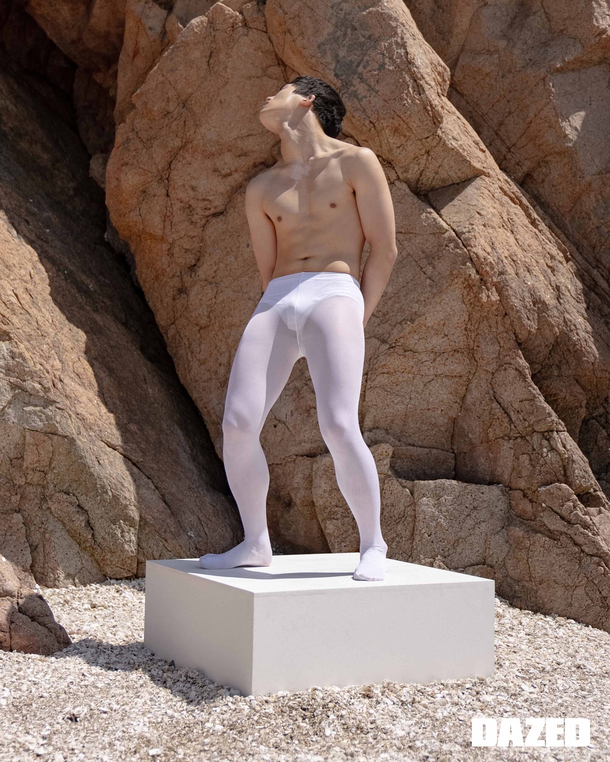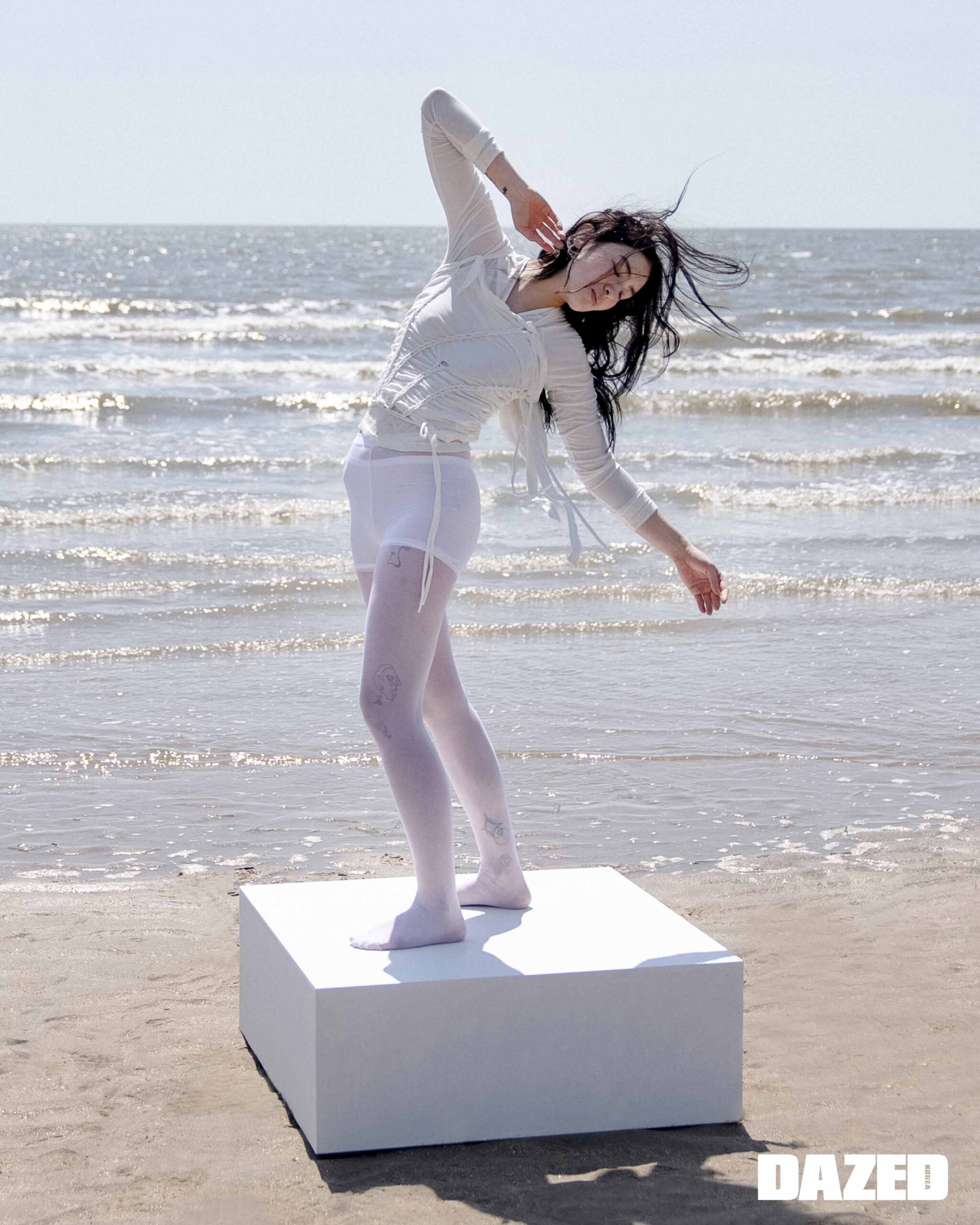 나오미가 입은 원 버튼 레이어드 티셔츠는 아드베스(Arts De Base), 드로즈는 에디터의 것. 준훈이 입은 롱 슬리브 티셔츠는 메종 마레(Masion Marais), 레이스 타이츠는 2000아카이브스(2000Archives), 브리프는 에디터의 것.