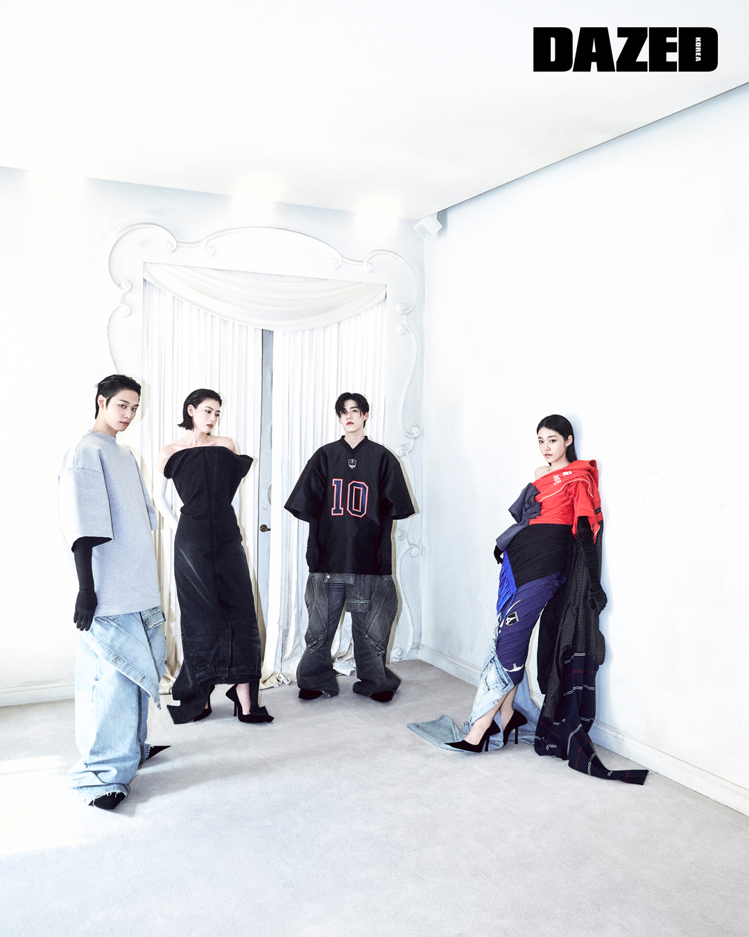 발렌시아가 53번째 쿠튀르 컬렉션이 끝나고 3시간이 지난 6월 26일 오후 4시. 쿠튀르 컬렉션을 직접 관람한 한국의 노윤서와 더보이즈 주연, 일본의 아야카 미요시, 태국의 피피 끄릿 암누아이데차콘까지 아시아를 대표하는 친구들이 쿠튀르 살롱에 다시 모였다. 불과 얼마 전까지 이 방을 부유하던 군상의 체취와 체온이 옅게 남은 그 옷을 입고 함께 사진을 찍기 위해서. 젊고 유망한 우리들의 새록한 기억이 여기에 있다.