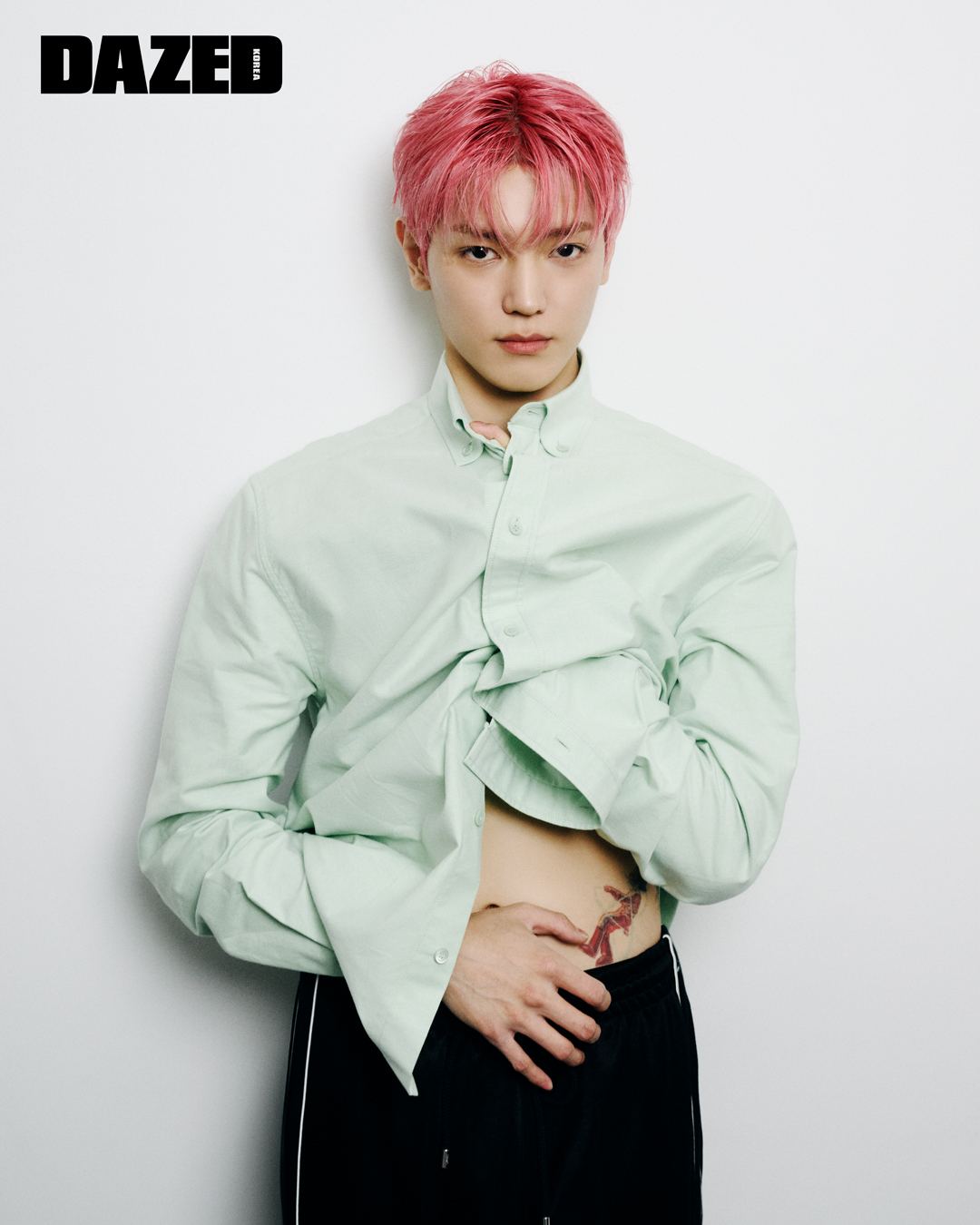 “이게 공개되는 시점은 완전 더울 때예요.” 그와 마주앉은 건 해가 저물면 기운이 떨어지던, 아직은 추운 초봄 밤이었다. 태용이 운을 뗐다. “과거의 나와 마주하는 거죠.” 그런 답을 하는 태용의 곁에는 준비한 도시락이 하나 있었다. 촬영으로 밥때를 놓친 태용을 위해 챙겨둔, 2018년도 <데이즈드>에 실린 사진이 스티커로 붙어 있는 그런 도시락. 스티커에 자꾸만 눈길이 갔다. 지금은 디렉터가 된 <데이즈드>의 에디터가 6년 전 태용을 직접 찍은 그 사진을 나도 오랫동안 좋아했으니까.