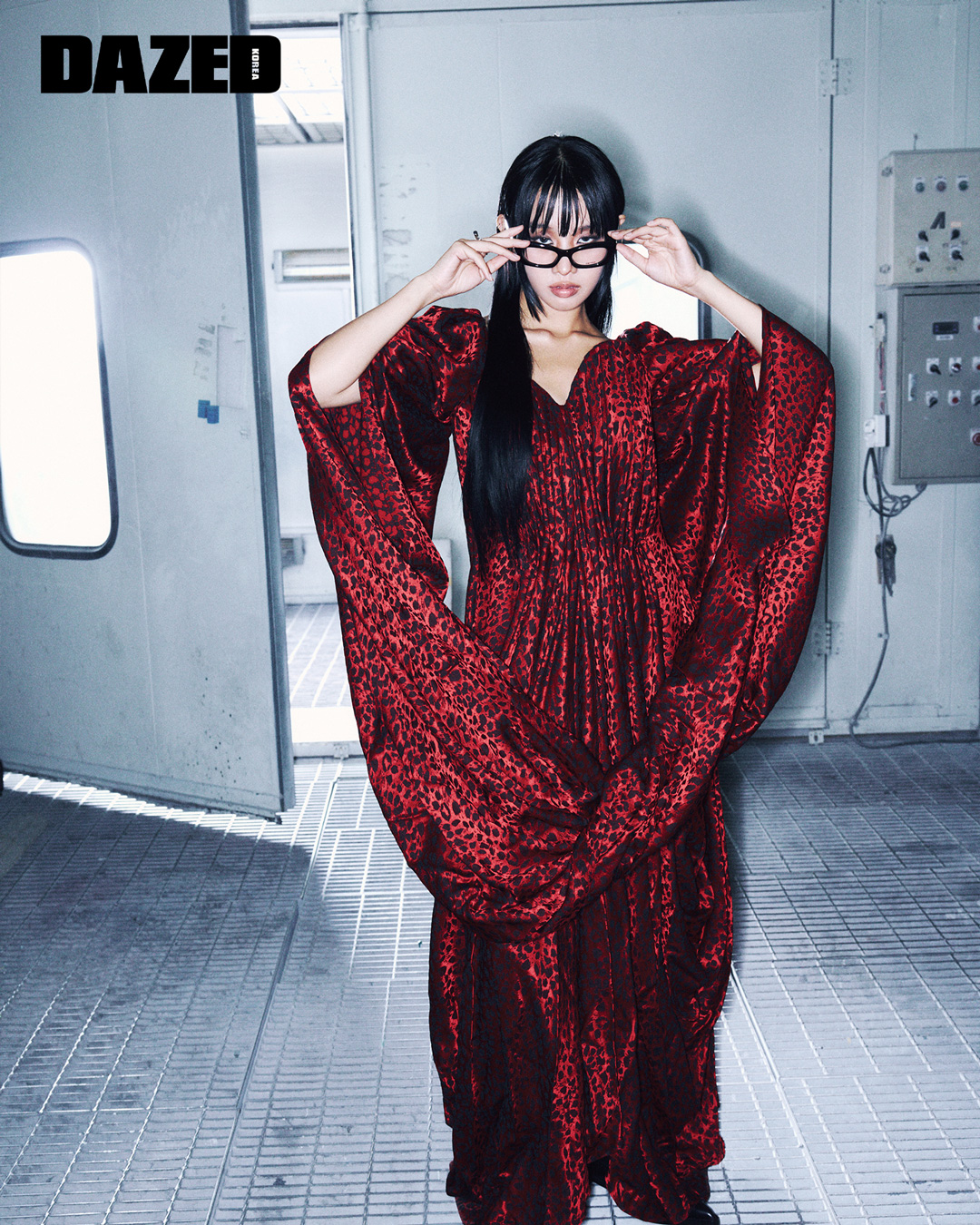 레오파드 자카드 디테일의 실크 비스코스 드레이프 드레스와 날렵한 앞코가 특징인 레더 버디 브로그, 맥퀸 로고 캐츠아이 아이웨어, 실버 메탈 크로스바 링은 모두 맥퀸 by 션 맥기르(McQueen by Seán McGirr).