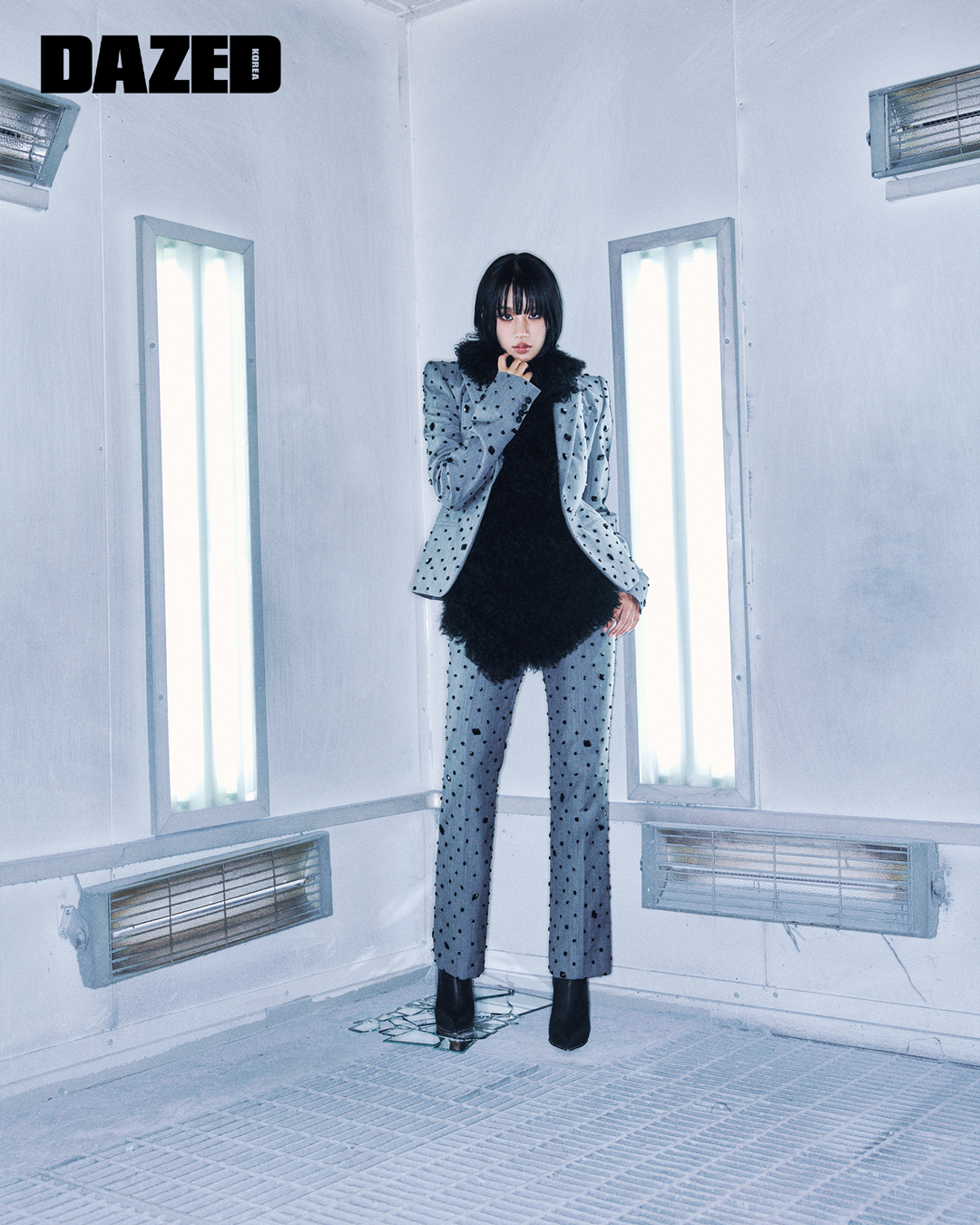 제트 스톤 자수 디테일의 울 모헤어 테일러드 재킷과 팬츠 셋업, 시어링과 코튼 저지로 이루어진 베스트, 레더 버디 부츠는 모두 맥퀸 by 션 맥기르(McQueen by Seán McGirr).