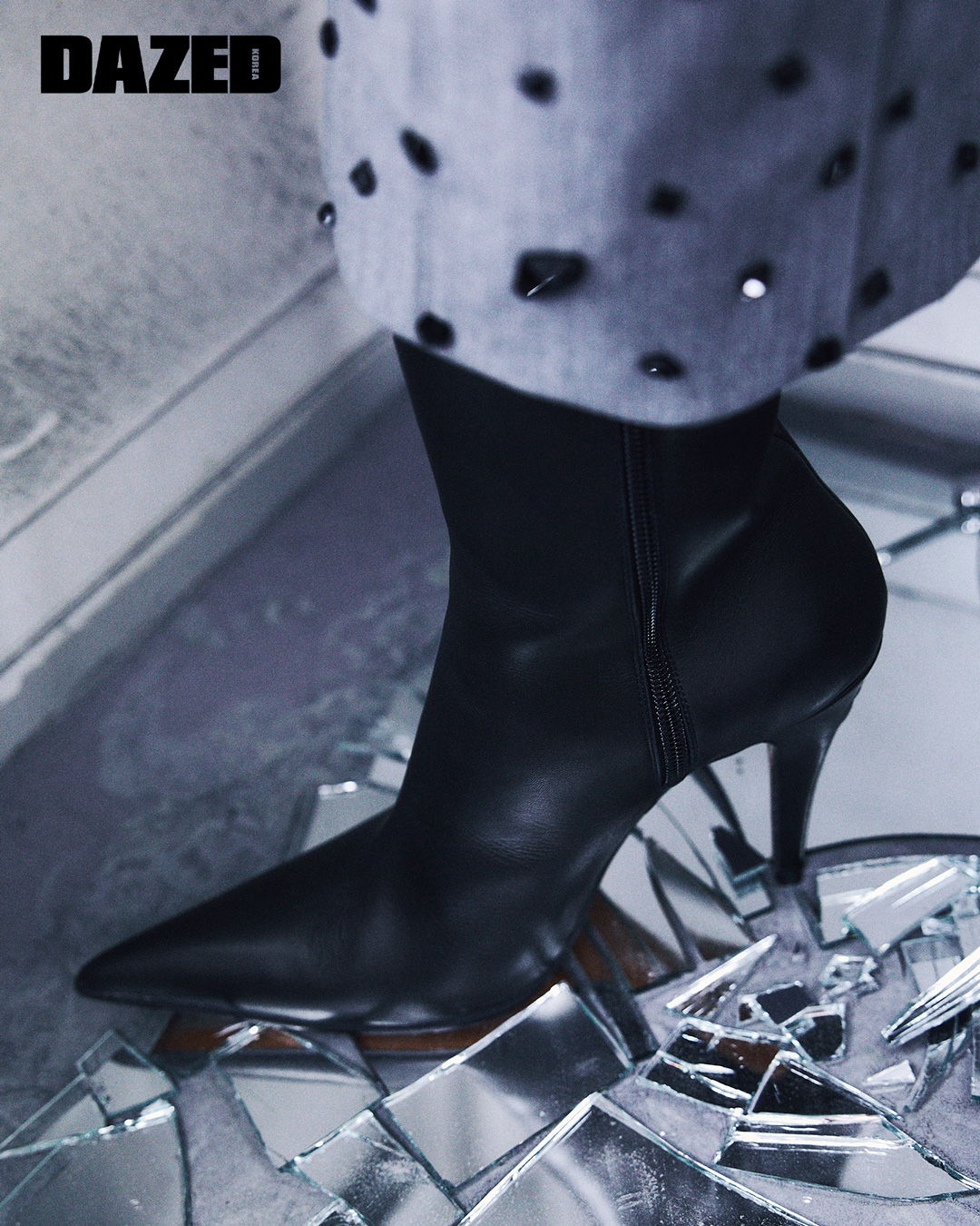 새의 부리 형태에서 영감을 받은 스틸레토 힐과 날렵한 앞 코가 특징인 레더 버디 부츠는 맥퀸 by 션 맥기르(McQueen by Seán McGirr).