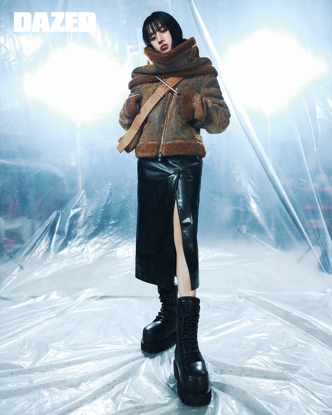 시어링 에비에이터 재킷과 스누드, 레더 펜슬 스커트, 청키한 실루엣의 레더 파라슈트 부츠, 메탈 T-바 버클이 돋보이는 피칸 컬러 그레이니 카프스킨 레더 슬링 백은 모두 맥퀸 by 션 맥기르(McQueen by Seán McGirr).