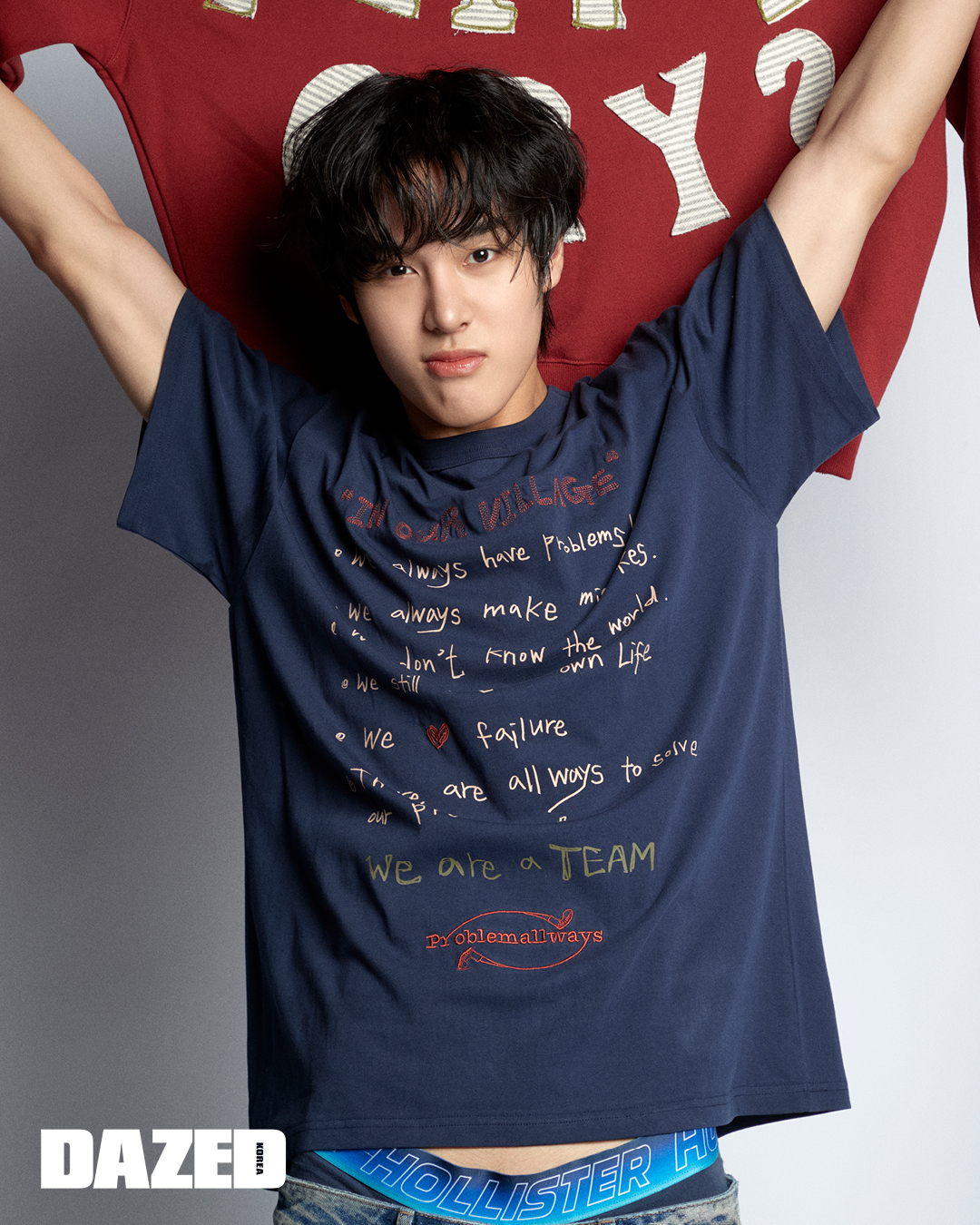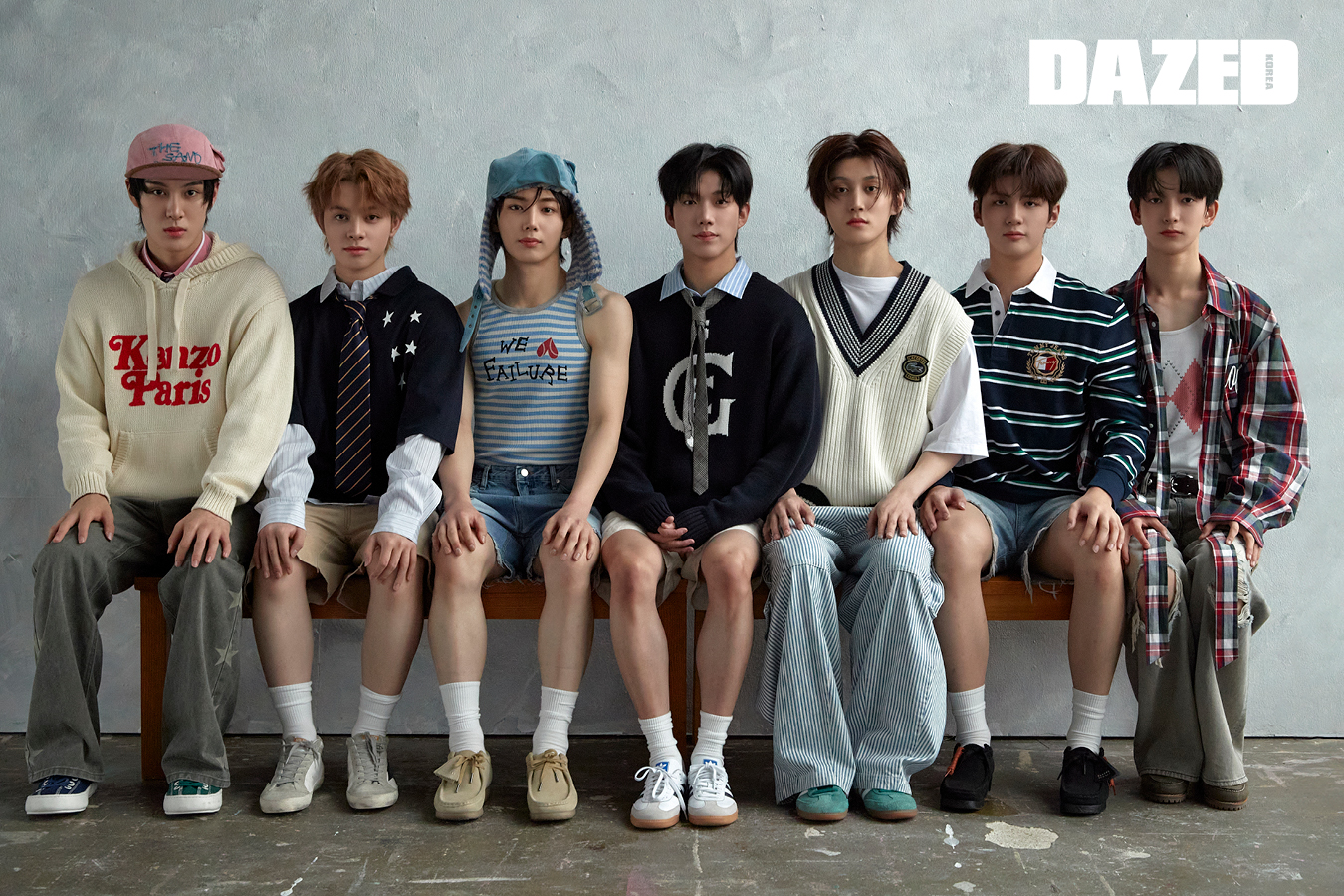 최한이 입은 후디는 겐조(Kenzo), 레이어링한 핑크 컬러 스트라이프 셔츠는 아르켓(Arket), 스타 디테일 팬츠는 웨스켄(Wesken), 커스터마이징 싱글 슈즈는 캠퍼(CAMPER), 포켓 디테일 캠프 캡은 프라블럼올웨이즈(Problemallways). 끼엔이 입은 스타 디테일 피케 셔츠는 가든 익스프레스(Garden Express), 레이어링한 스트라이프 셔츠는 애니타임로릭(Anytimeloleak), 쇼츠는 윈더(Winder), 스니커즈는 골든구스(Golden Goose), 스트라이프 타이와 삭스는 에디터의 것. 지우가 입은 스트라이프 슬리브리스 니트 톱과 이어 플랩 캡은 프라블럼올웨이즈(Problemallways), 쇼츠는 윈더(Winder), 슈즈는 클락스 오리지널(Clarks Originals), 삭스는 에디터의 것. 현민이 입은 로고 디테일 니트 톱은 가든 익스프레스(Garden Express), 레이어링한 스트라이프 셔츠는 아르켓(Arket), 쇼츠는 에이치앤엠(H&M), 스니커즈는 아디다스 오리지널스(adidas Originals), 타이와 삭스는 에디터의 것. 리오토가 입은 브이넥 니트 베스트는 라코스테(Lacoste), 스트라이프 팬츠는 겐조(Kenzo), 스니커즈는 아디다스 오리지널스(adidas Originals), 레이어링한 톱은 에디터의 것. 도하가 입은 스트라이프 피케 셔츠는 타미 진스(Tommy Jeans), 슈즈는 클락스 오리지널(Clarks Originals), 쇼츠와 삭스는 에디터의 것. 지빈이 입은 오버사이즈 체크 셔츠와 아가일 패턴 슬리브리스 톱은 프롬아를(From Arles), 디스트레스트 디테일 팬츠와 벨트는 에이치앤엠(H&M), 슈즈는 팀버랜드(Timberland).