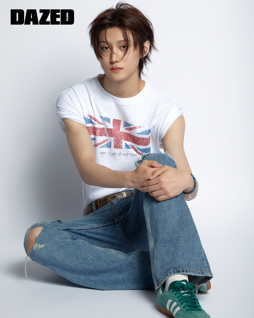 프린트 톱은 이어스트(Eerst), 스니커즈는 아디다스 오리지널스(adidas Originals), 디스트레스트 디테일 팬츠와 브레이슬릿, 벨트와 삭스는 모두 에디터의 것.