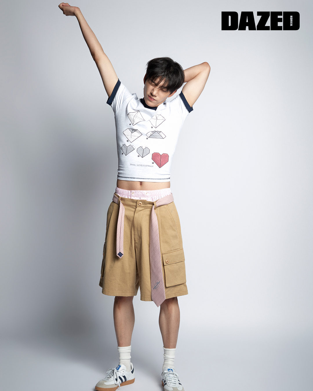 크롭트 링거 톱과 벨트로 착용한 타이는 프라블럼올웨이즈(Problemallways), 하프 팬츠는 프롬아를(From Arles), 스니커즈는 아디다스 오리지널스(adidas Originals), 브레이슬릿과 브리프, 삭스는 모두 에디터의 것.