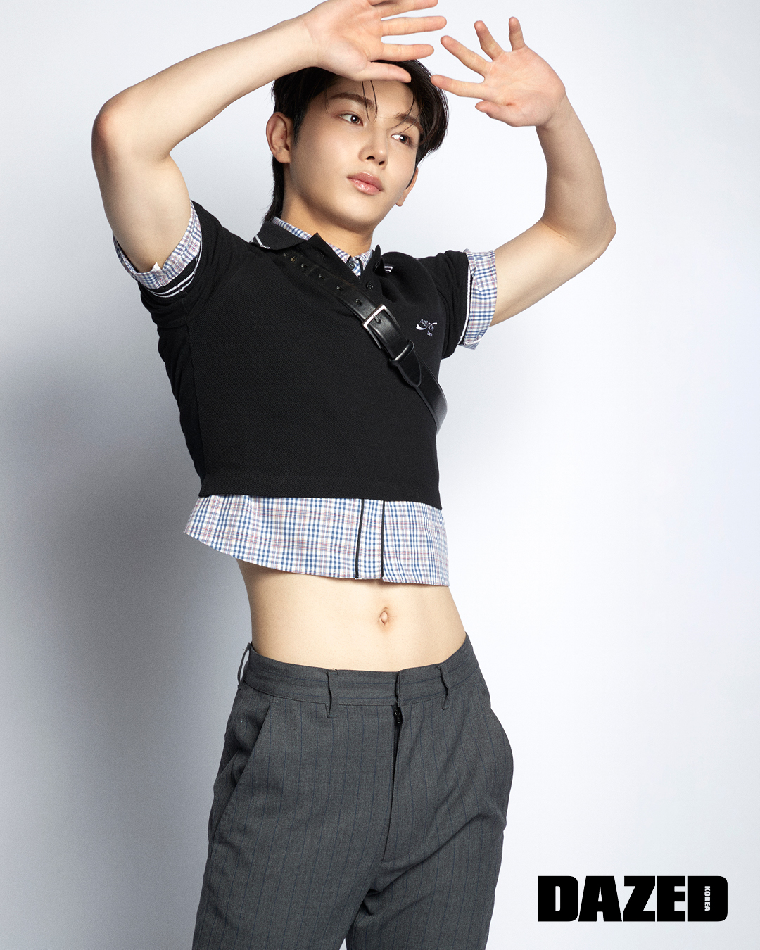 블랙 컬러 크롭트 피케 셔츠와 레이어링한 체크 셔츠는 푸시버튼(PushBUTTON), 팬츠는 프롬아를(From Arles), 어깨에 착용한 벨트는 에디터의 것.