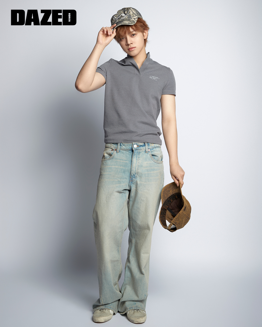 그레이 피케 셔츠는 레이블리스(Labeless), 스니커즈는 골든구스(Golden Goose), 카무플라주 패턴 캡과 브라운 컬러 캡은 오픈와이와이(Open YY), 데님 팬츠는 에디터의 것.