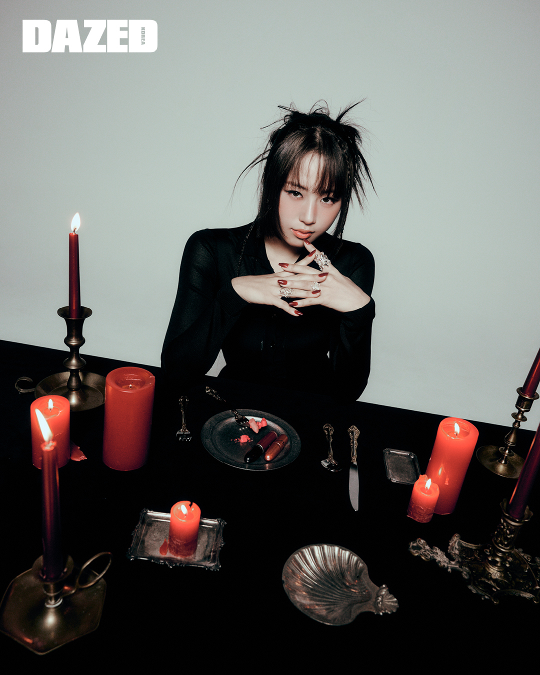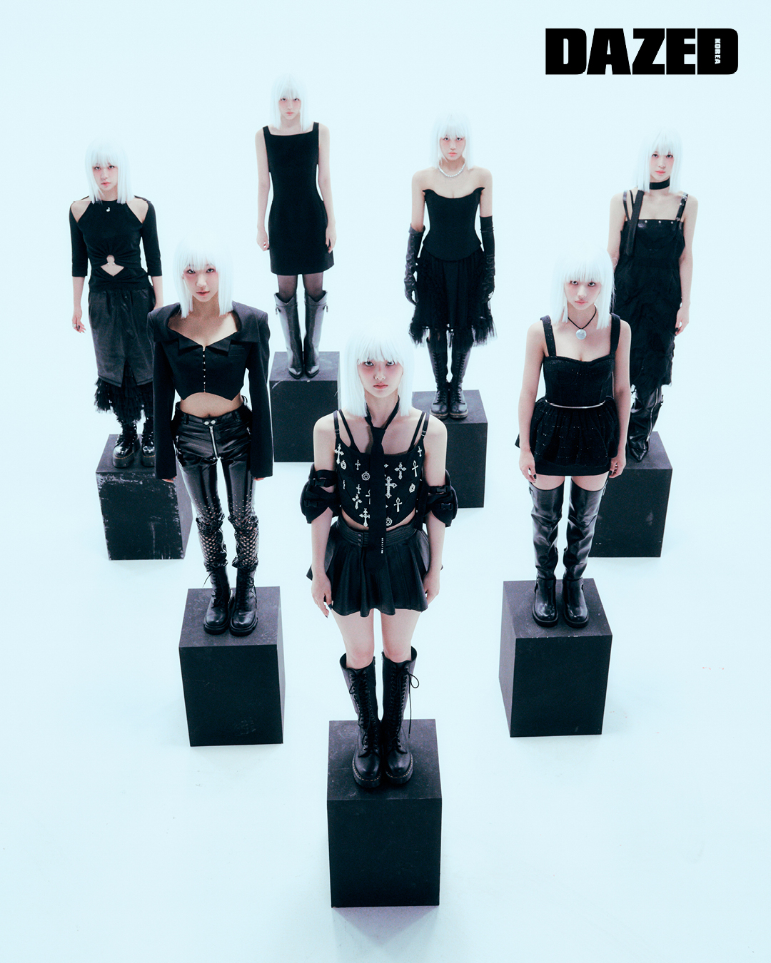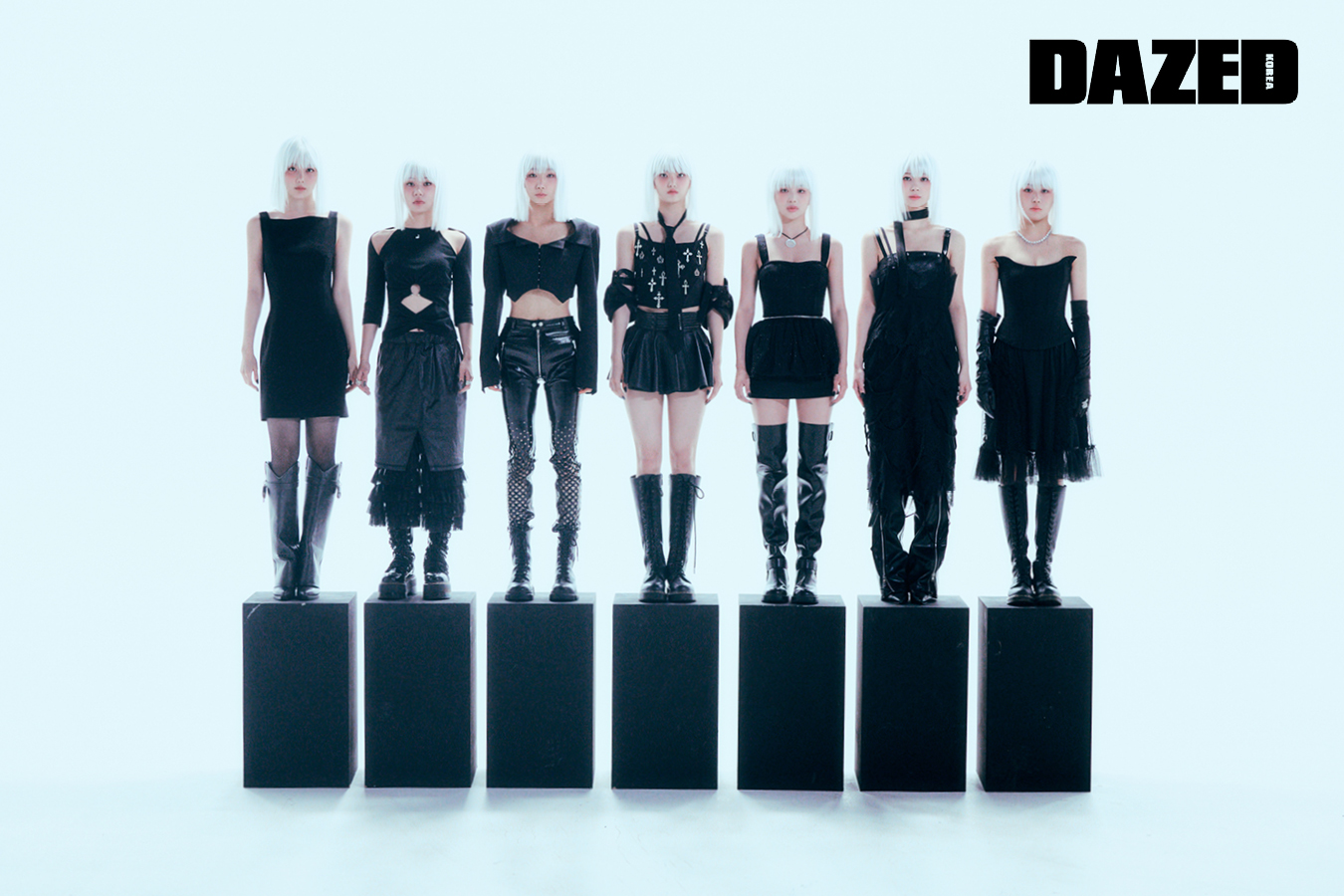 윤서가 입은 블랙 드레스와 롱부츠는 지방시(Givenchy), 타이츠는 에디터의 것. 휴이가 입은 컷아웃 디테일 톱은 쿄(Kyo), 러플 디테일 레더 스커트는 김미더영(Gimmetheyoung), 레이스업 부츠는 에디터의 것. 엠마가 입은 크롭트 재킷은 무아가(Muaga), 펀칭 디테일 에나멜 팬츠는 한나신(Hannah Shin), 슈즈는 에디터의 것. 켈리가 입은 스커트는 알라이아(ALAÏA), 레이스업 부츠는 닥터마틴(Dr. Martens), 참 장식 톱과 타이, 보호대는 모두 에디터의 것. 클로이가 입은 지퍼 디테일의 트위드 벌룬 뷔스티에는 한나신(Hannah Shin), 스커트는 알렉산더왕(alexanderwang), 니하이 부츠는 찰스앤키스(CHARLES & KEITH), 네크리스는 에디터의 것. 빈이 입은 시폰 드레스는 모스키노(Moschino), 이너로 입은 레더 톱 드레스는 엘프엘프엘프(Elfelfelf), 지퍼 디테일 챕스는 아드베스(Arts De Base), 슈즈와 타이는 에디터의 것. 이나가 입은 뷔스티에 톱은 푸시버튼(PushBUTTON), 러플 디테일 샤 스커트는 생긴(Saengin),레이스업 부츠는 닥터마틴(Dr. Martens), 펄 네크리스와 글러브는 에디터의 것.