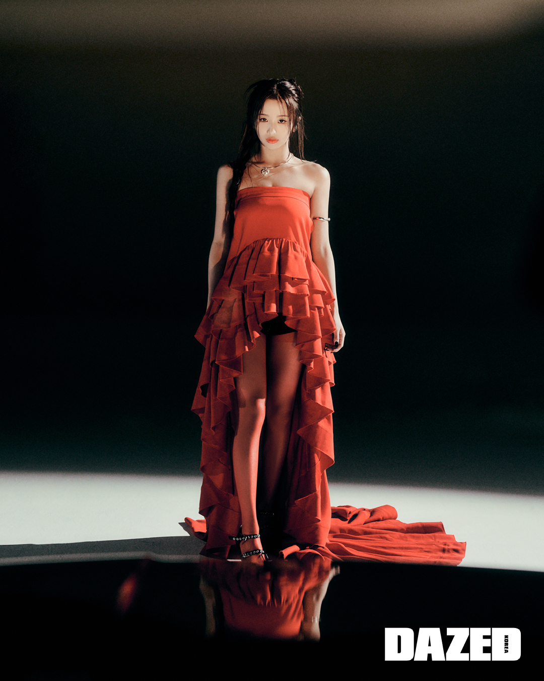 레드 시폰 드레스는 코치(Coach), 에나멜 청키 앵클부츠는 찰스앤키스(CHARLES & KEITH), 오른손 중지에 착용한 링과 브레이슬릿은 디어엑스(Dear X), 초커와 왼손 검지에 착용한 링, 타이츠는 모두 에디터의 것.