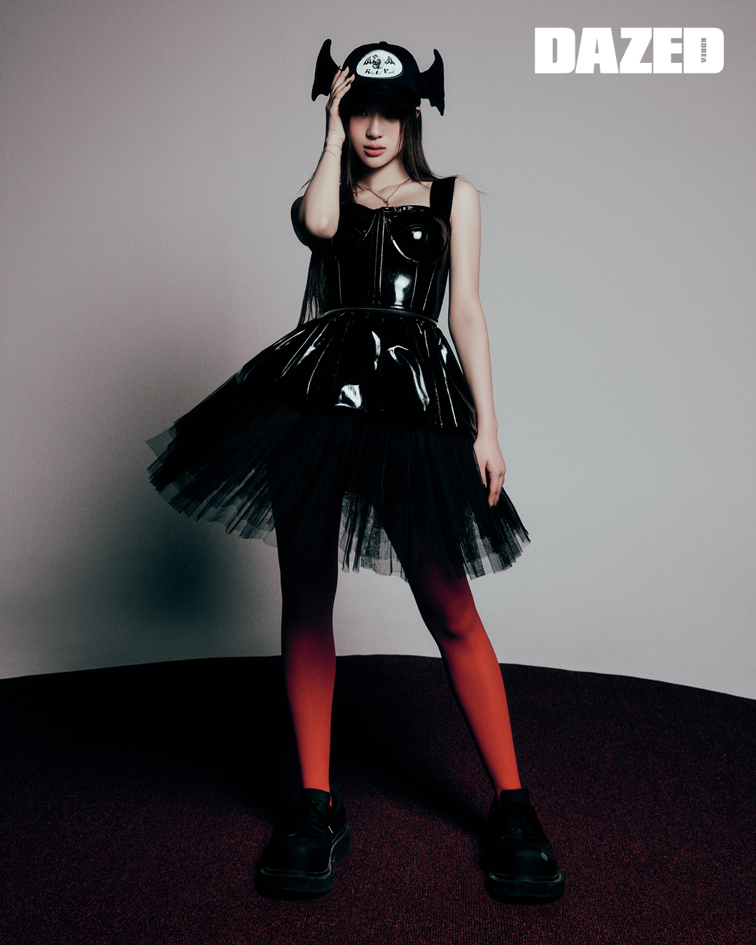 지퍼 디테일의 에나멜 벌룬 뷔스티에는 한나신(Hannah Shin), 네크리스는 디어엑스(Dear X), 튀튀 스커트와 슈즈, 볼캡, 타이츠는 모두 에디터의 것.