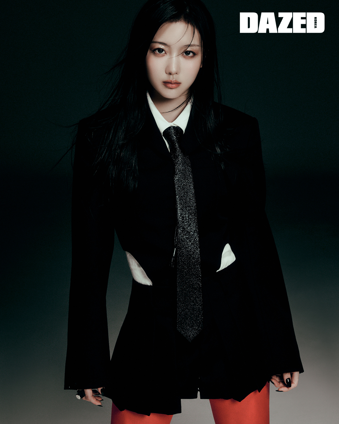 블랙 슬림 드레스는 톰 포드(Tom Ford), 오른손 약지, 왼손 검지와 약지에 착용한 링은 모두 디어엑스(Dear X).