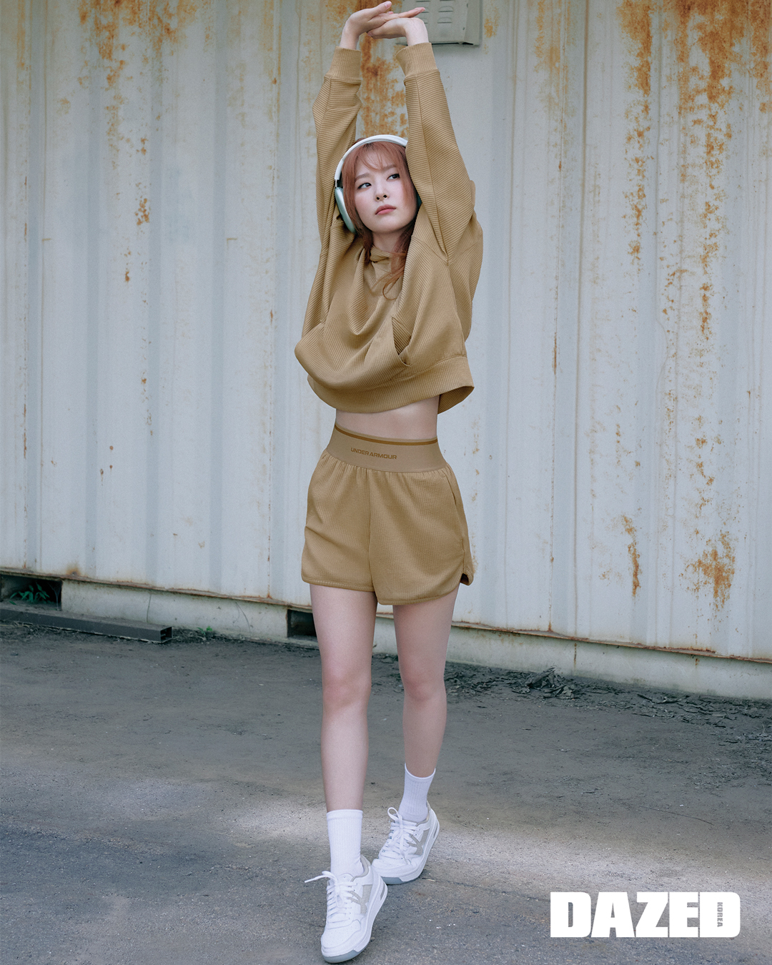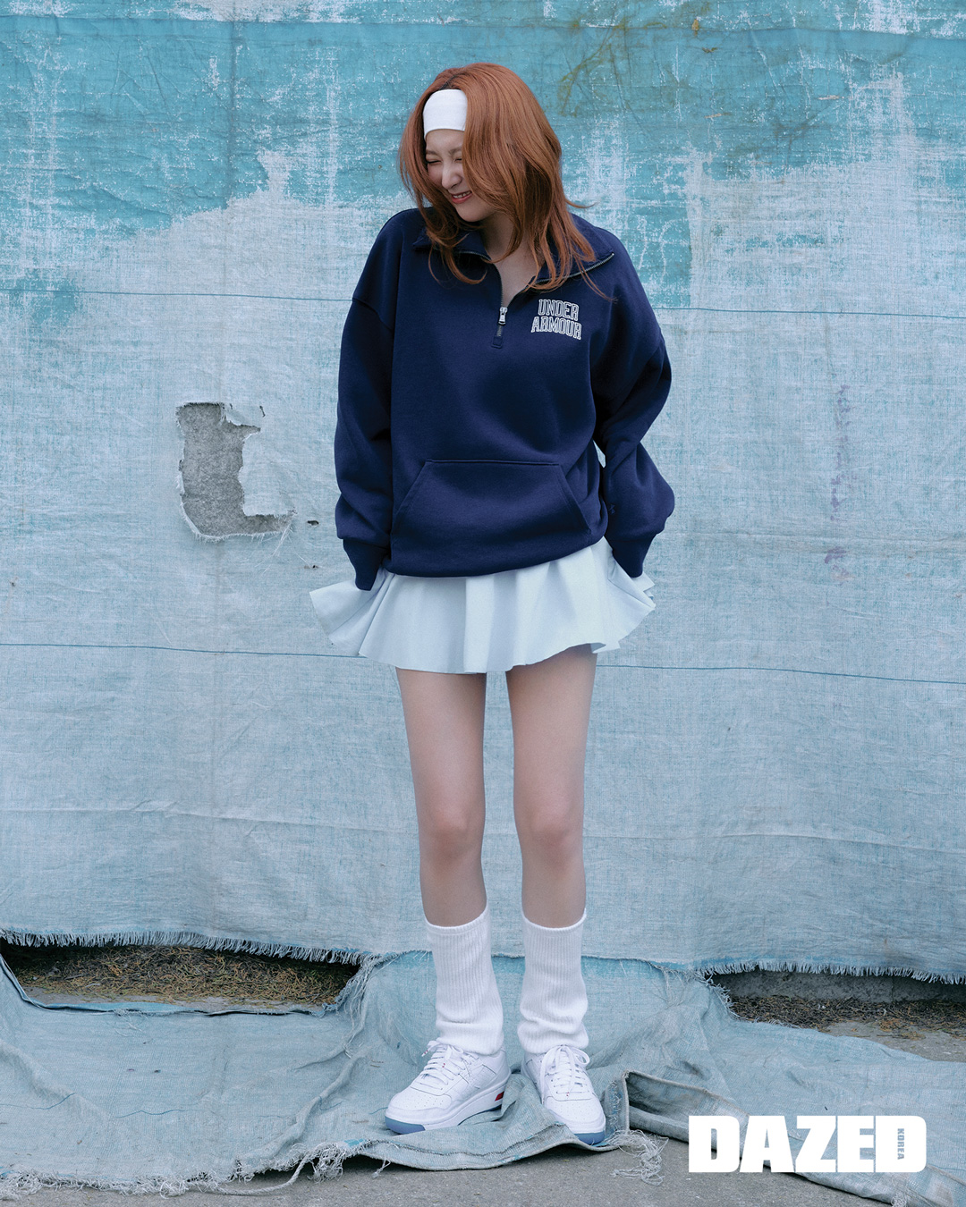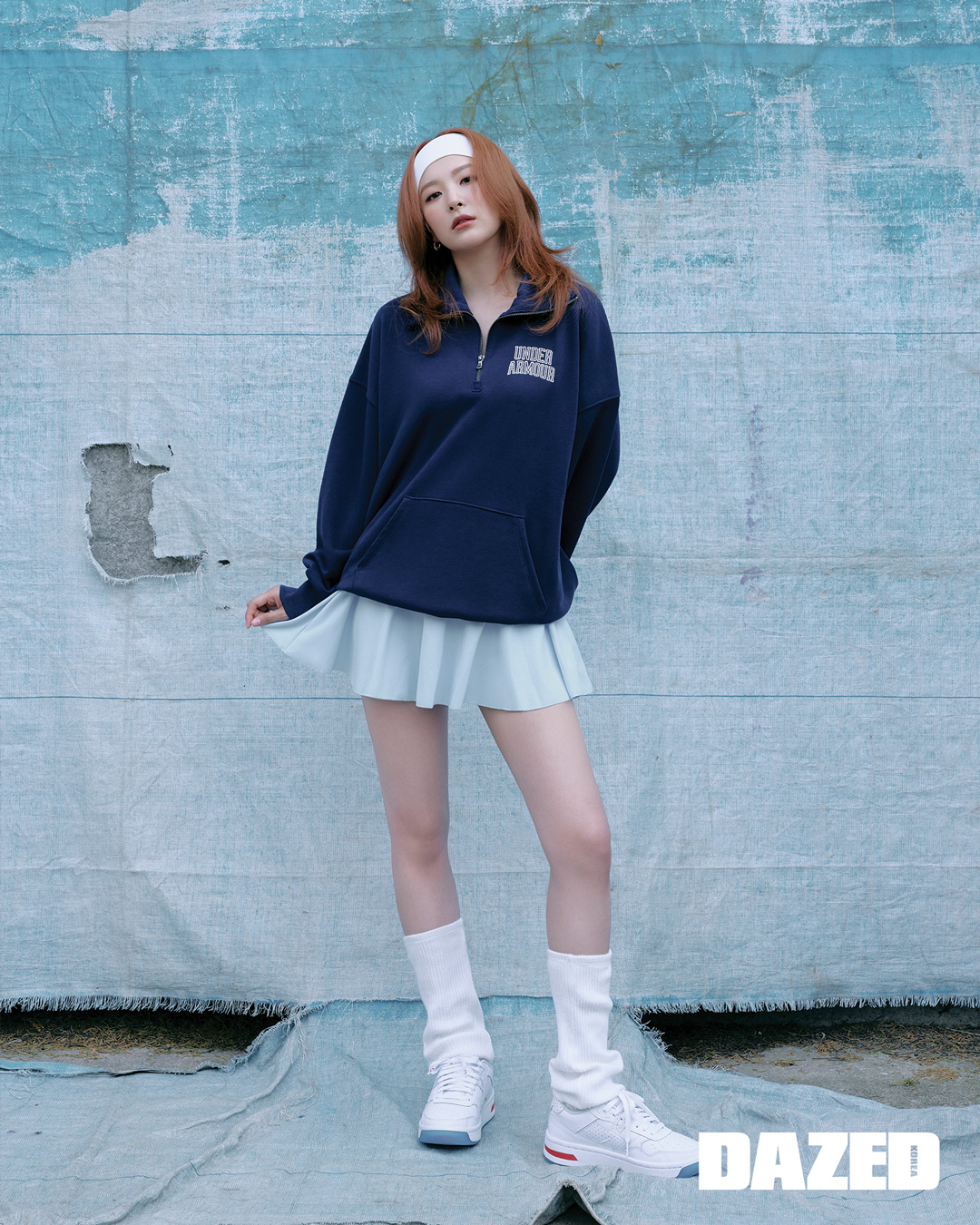 UA 아이콘 헤비웨이트 테리 오버사이즈 집, UA 모션 스커트, UA 여성 코트 96 운동화는 모두 언더아머(Under Armour). 헤드밴드와 화이트 레그 워머는 스타일리스트의 것.