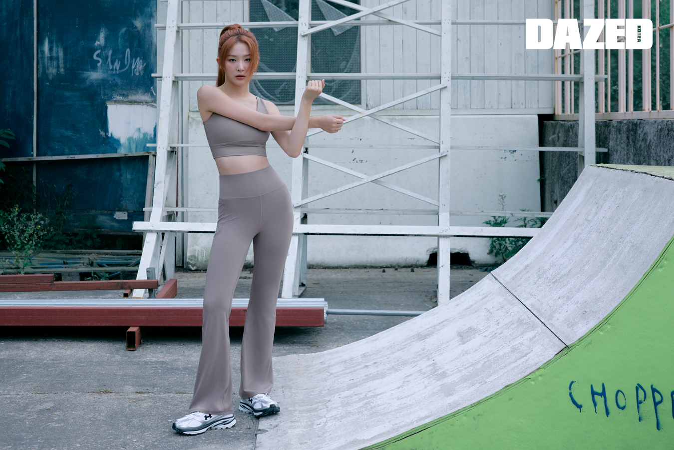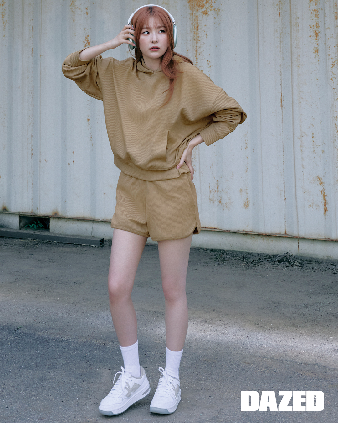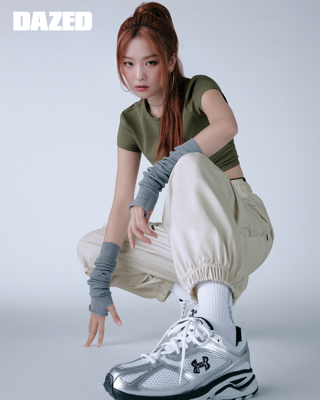 UA 아이콘 헤비웨이트 테리 오버사이즈 집, UA 모션 스커트, UA 여성 코트 96 운동화는 모두 언더아머(Under Armour). 헤드밴드와 화이트 레그 워머는 스타일리스트의 것.