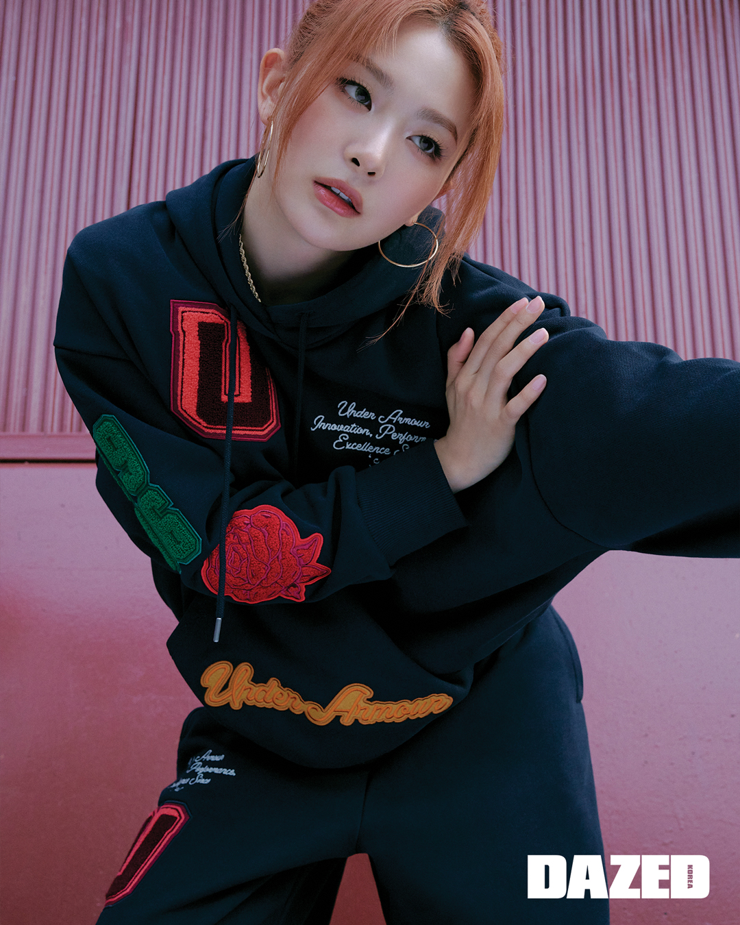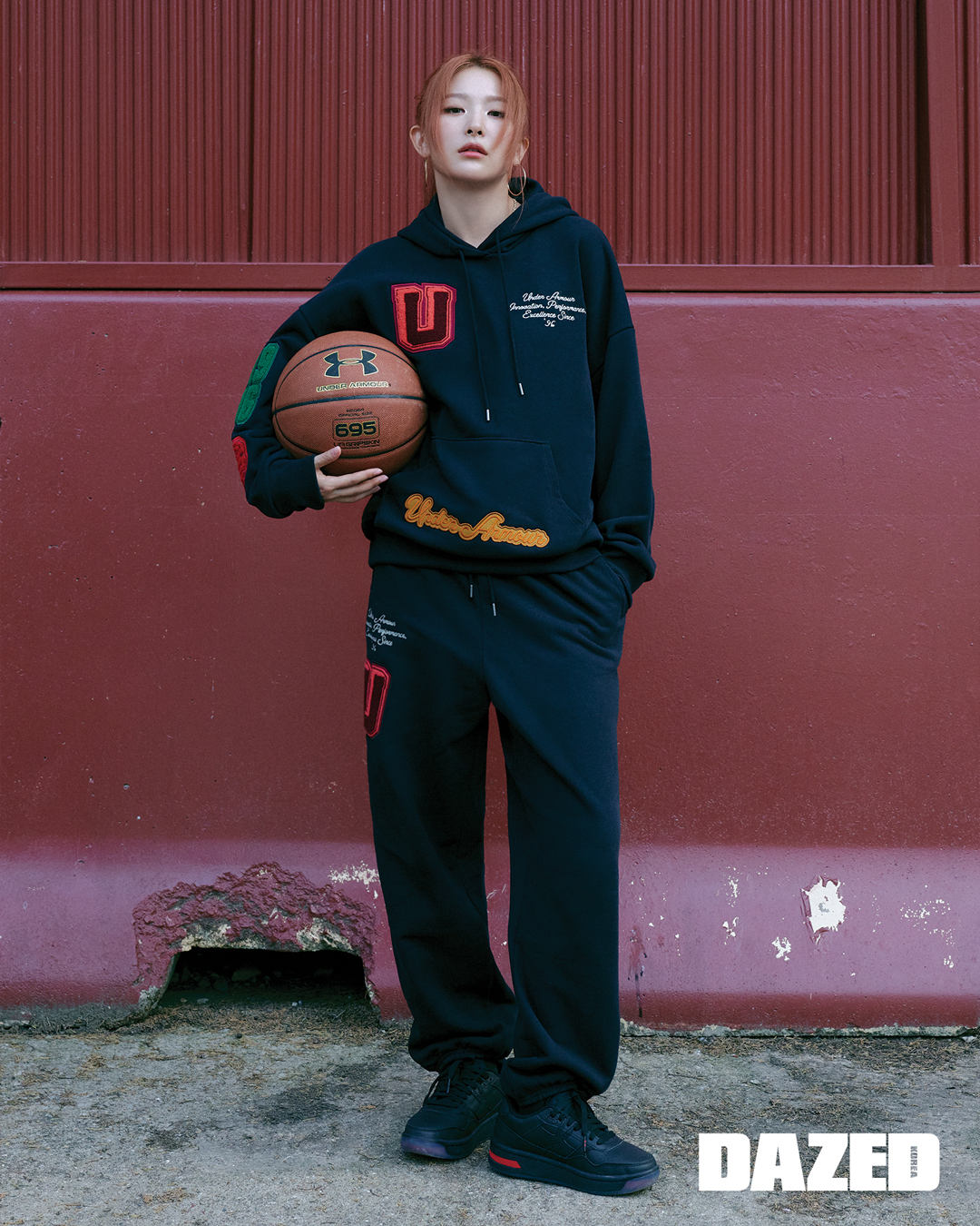 UA 아이콘 헤비웨이트 테리 오버사이즈 후디와 UA 아이콘 헤비웨이트 테리 오버사이즈 조거 팬츠, UA 여성 코트 96 운동화는 모두 언더아머(Under Armour), 이어링은 스타일리스트의 것.