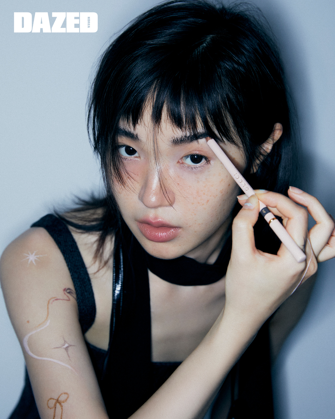 구찌 뷰티 쿠션 드 보떼 셰이드 02의 내장된 퍼프를 이용해 블렌딩하듯 펴 발라 피부 톤을 자연스럽게 정돈한다. 구찌 뷰티 크레이용 데피니씨옹 쑤르씰 파우더 아이브로우 펜슬 6 누아로 눈썹모 사이를 메우며 선명한 눈썹을 연출한다. 구찌 뷰티 구찌 글로스 아 레브르 플럼핑 스무딩 & 모이스쳐라이징 립글로스 219 버사 핑크를 입술에 발라 광택감이 느껴지면서도 촉촉한 입술을 연출하고, 립 라인보다 확장해 발라 자연스러운 오버 립을 만든다. 가볍고 고급스러운 텍스처로 뭉침 없는 블렌딩되고 매트하게 마무리되는 구찌 크레이용 데피니씨옹 쑤르씰 파우더 아이브로우 펜슬 6 누아 1.19g 4만8000원, 구찌 뷰티(Gucci Beauty).