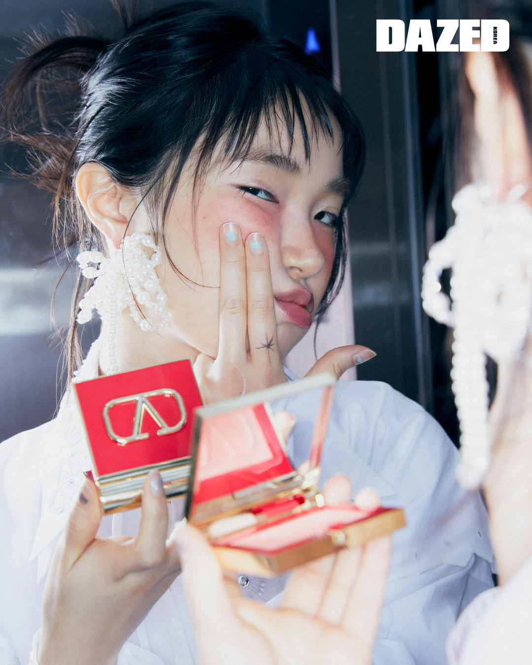 발렌티노 뷰티 베리 발렌티노 파운데이션 LN2를 물 먹인 퍼프로 두드려 발라 피부 톤을 자연스럽게 정돈한다. 발렌티노 뷰티 아이 투 치크 08 로만 스카이의 내장된 브러시를 이용해 볼 전체에 펴 바른 뒤 손가락을 이용해 치크의 경계선을 흐리게 만든다. 로마의 빛에서 영감을 받은 컬러로, 아이와 치크 위에서 유화처럼 맑고 선명하게 발색되는 아이 투 치크 08 로만 스카이 3.6g 7만9000원, 발렌티노 뷰티(Valentino Beauty).