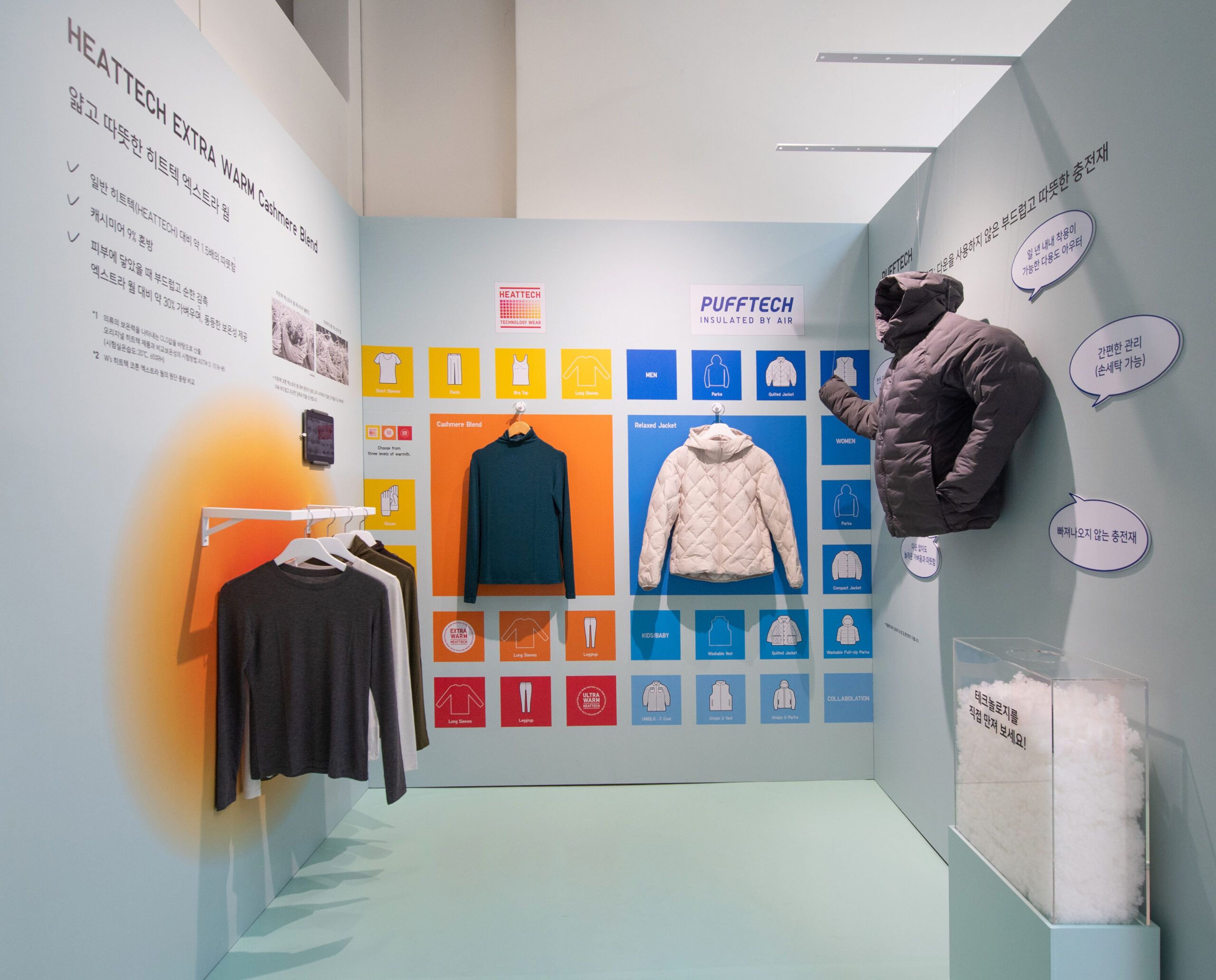 히트텍과 퍼프테크 라인업이 한쪽 벽면에 전시되어 따뜻함과 부드러운 감촉을 체험할 수 있다. 부드러운 퍼프테크 충전재를 직접 만져보는 것도 가능하다.