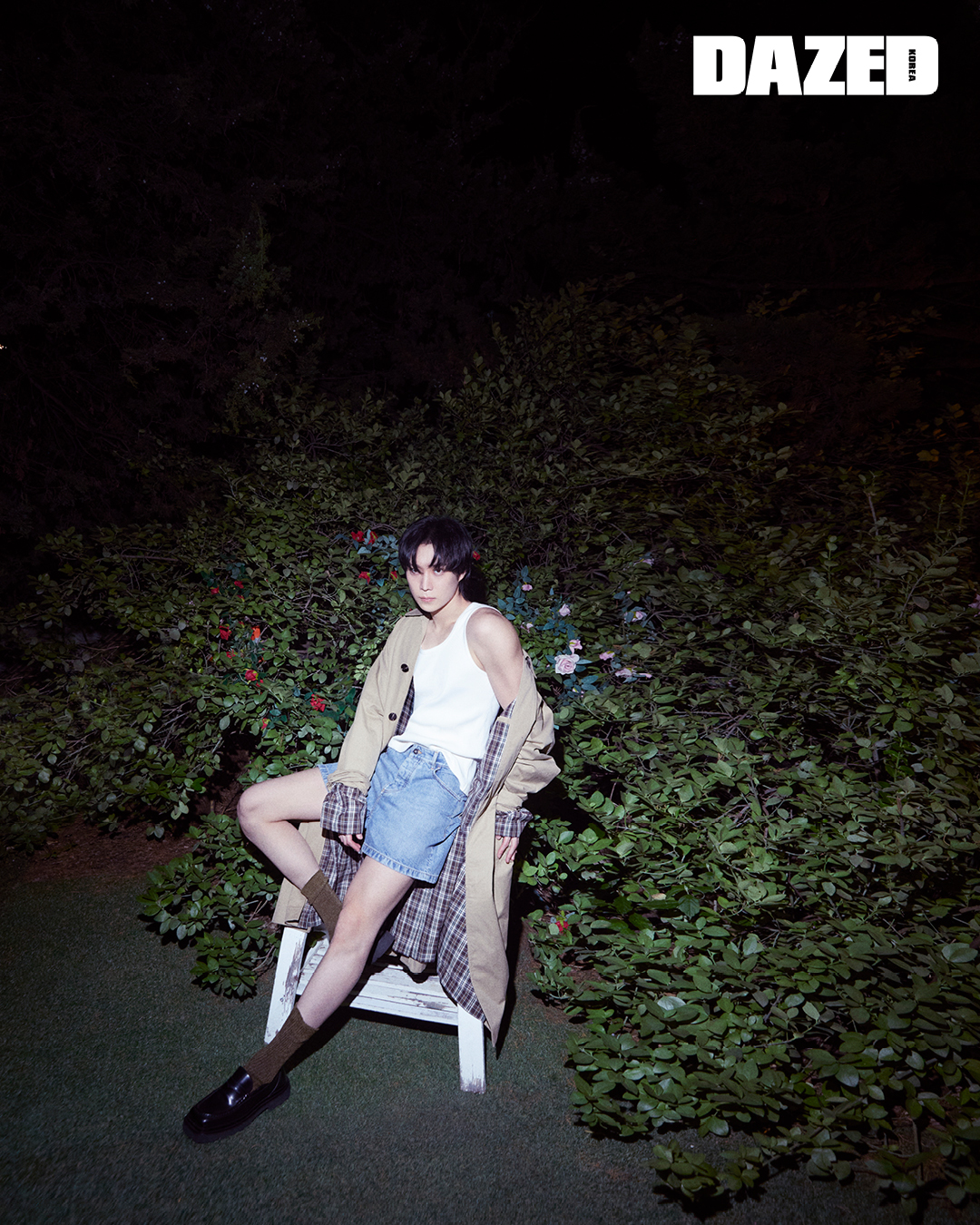 체크 패턴 커프스 트렌치코트와 화이트 슬리브리스 톱, 데님 쇼츠는 모두 보테가 베네타(Bottega Veneta), 카키 컬러 니트 삭스는 지방시(Givenchy), 블랙 로퍼는 돌체앤가바나(Dolce&Gabbana).