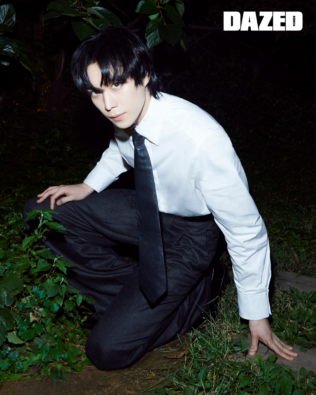 화이트 셔츠와 그레이 울 팬츠, 더비 슈즈는 모두 생 로랑 by 안토니 바카렐로(Saint Laurent by Anthony Vaccarello), 레더 타이는 보테가 베네타(Bottega Veneta).