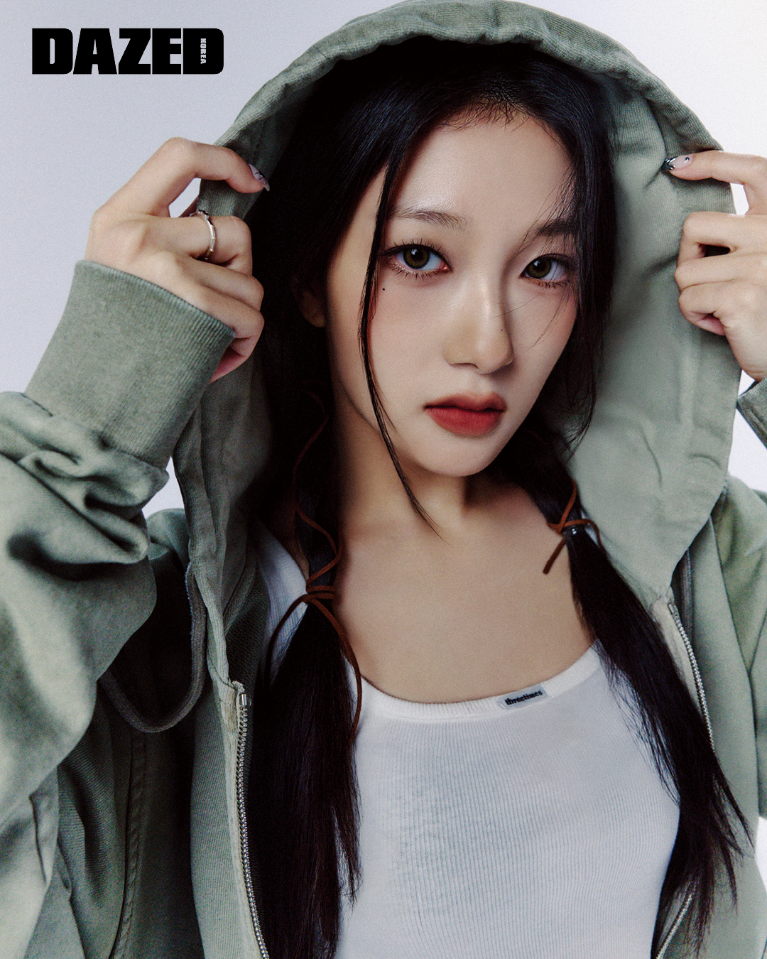 워싱 집업 후드는 웰던(We11done), 스퀘어 네크라인 슬리브리스 톱은 쓰리타임즈(Threetimes), 링은 서연의 것.