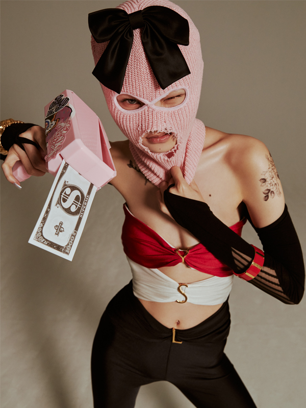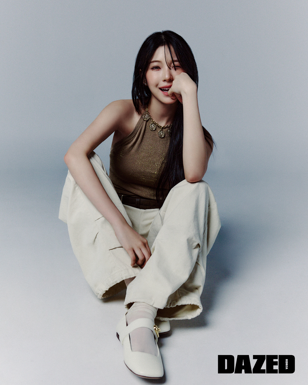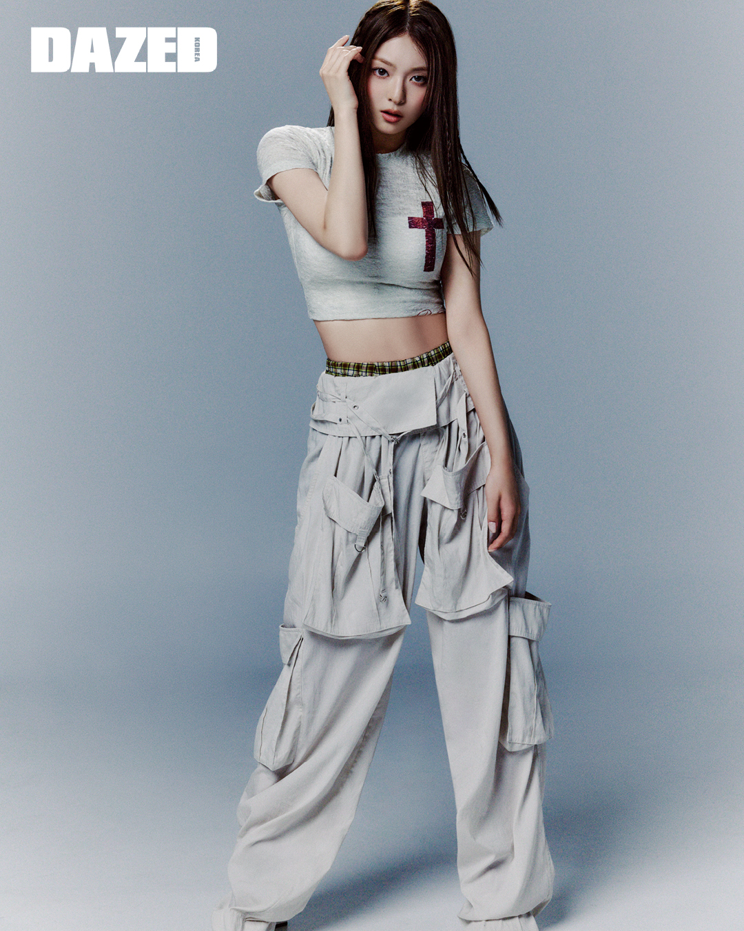 펜던트 글리터 홀터넥 톱은 젤로젤로(Jello Jello), 카고 팬츠는 24안즈(24ans), 버클 벨트는 타카라바코(Takaravaco), 브이로고 락커 메리제인은 발렌티노 가라바니(Valentino Garavani), 시스루 삭스는 에디터의 것, 링은 지헌의 것.
