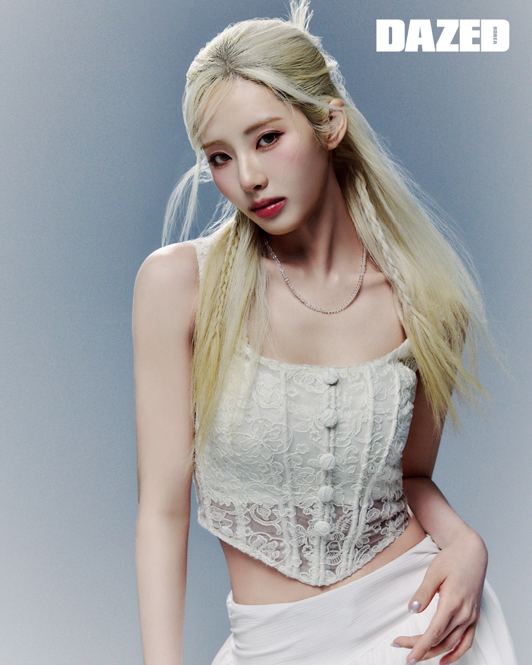 시스루 레이스 코르셋 슬리브리스 톱은 셀프포트레이트(Self-Portrait), 러플 장식의 스커트는 에즈고니(Asgony), 네크리스는 누아누(Nuuanu), 이너로 입은 튜브톱은 에디터의 것.