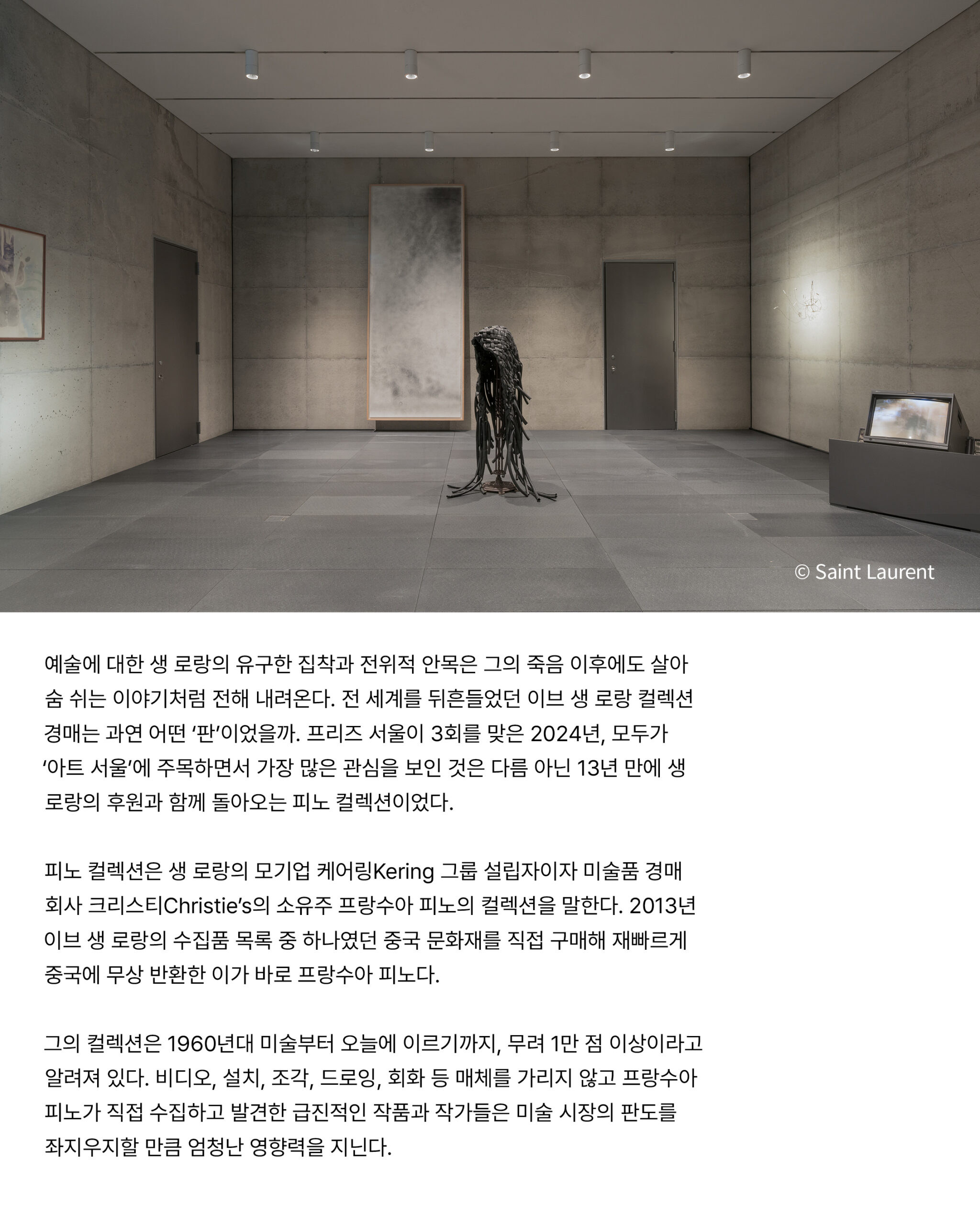 구경도 못 해 아쉬운 건 이브 생 로랑의 몬드리안 컬렉션이다. 태어나기도 전인 1965년 탄생한 피스들은 그로부터 60년가량 지난 지금, 모두가 아트와 패션을 한데 이야기 할 때 빠지지 않는 ‘작품’이다. 예술에 대한 생 로랑의 유구한 집착과 전위적 안목은 그의 죽음 이후에도 살아 숨 쉬는 이야기처럼 전해 내려온다. 전 세계를 뒤흔들었던 이브 생 로랑 컬렉션 경매는 과연 어떤 ‘판’이었을까. 프리즈 서울이 3회를 맞은 2024년, 모두가 ‘아트 서울’에 주목하면서 가장 많은 관심을 보인 것은 다름 아닌 13년 만에 생 로랑의 후원과 함께 돌아오는 피노 컬렉션.