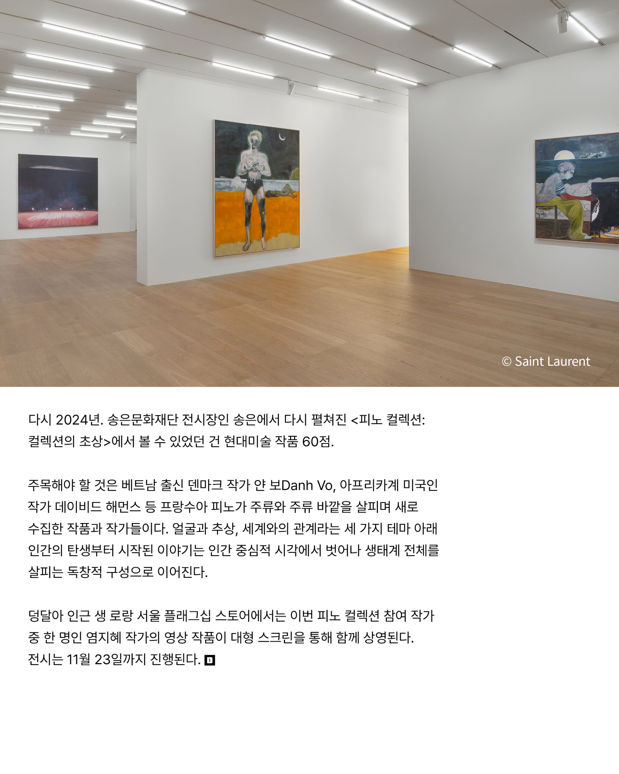 피노 컬렉션은 생 로랑의 모기업 케어링Kering 그룹 설립자이자 미술품 경매 회사 크리스티Christie’s의 소유주 프랑수아 피노의 컬렉션을 말한다. 2013년 이브 생 로랑의 수집품 목록 중 하나였던 중국 문화재를 직접 구매해 재빠르게 중국에 무상 반환한 이가 바로 프랑수아 피노다. 그의 컬렉션은 1960년대 미술부터 오늘에 이르기까지, 무려 1만 점 이상이라고 알려져 있다. 비디오, 설치, 조각, 드로잉, 회화 등 매체를 가리지 않고 프랑수아 피노가 직접 수집하고 발견한 급진적인 작품과 작가들은 미술 시장의 판도를 좌지우지할 만큼 엄청난 영향력을 지닌다. 2011년 아시아 최초로 송은에서 공개한 피노 컬렉션 전시 는 당시 데이미언 허스트, 제프 쿤스, 무라카미 다카시, 신디 셔먼 등 다수의 ‘스타’ 작가가 포진해 이들의 미공개 작품을 포함한 현대미술 작품 23점을 함께 볼 수 있어 큰 화제가 되었다.