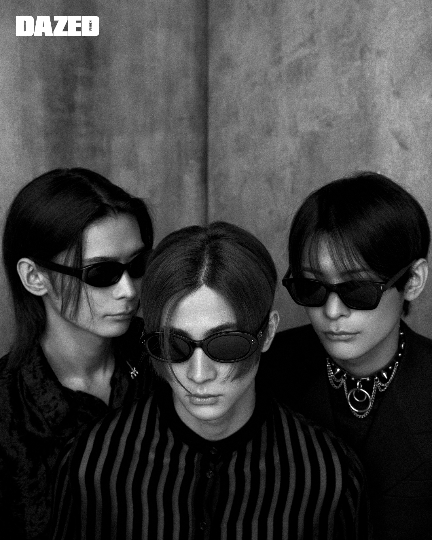 Ken이 입은 벨벳 셔츠는 잉크(EENK), 선글라스는 스타일리스트의 것. Matty가 입은 벨벳 스트라이프 셔츠와 선글라스는 스타일리스트의 것. Lyo가 입은 블랙 재킷은 토니 웩(Tony Wack), 시스루 이너 톱과 선글라스, 체인 초커는 모두 스타일리스트의 것.