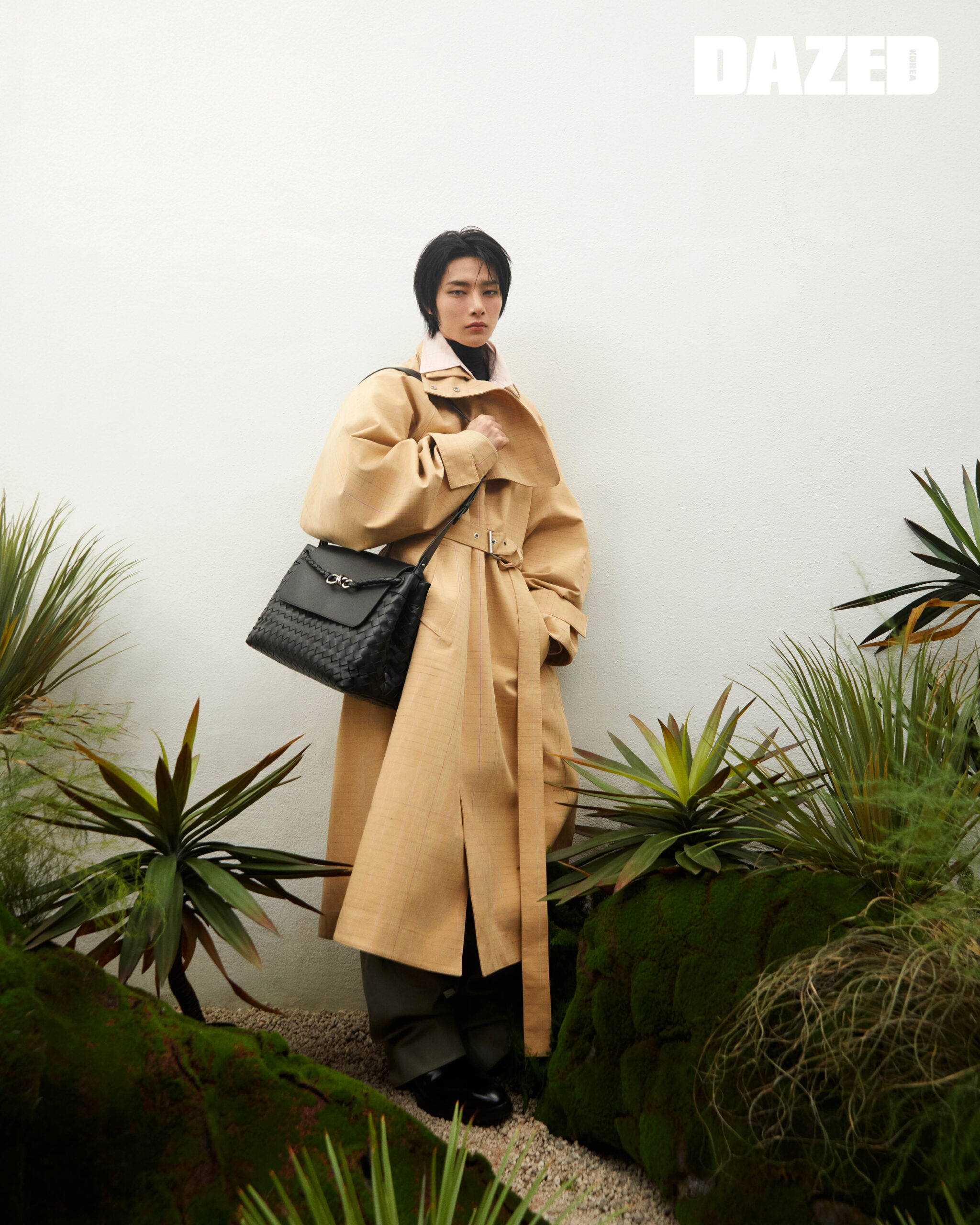 노트북 위빙 패턴의 울 트렌치코트와 그래프 노트북 디테일 코튼 셔츠, 라이트 코튼 스트레치 거즈 셔츠, 나파 레더 트라우저, 토리노 앵클부츠, 인트레치아토 위빙 기법으로 완성한 카프 스킨 소재의 미디엄 안디아모 메신저 백은 모두 보테가 베네타(Bottega Veneta).