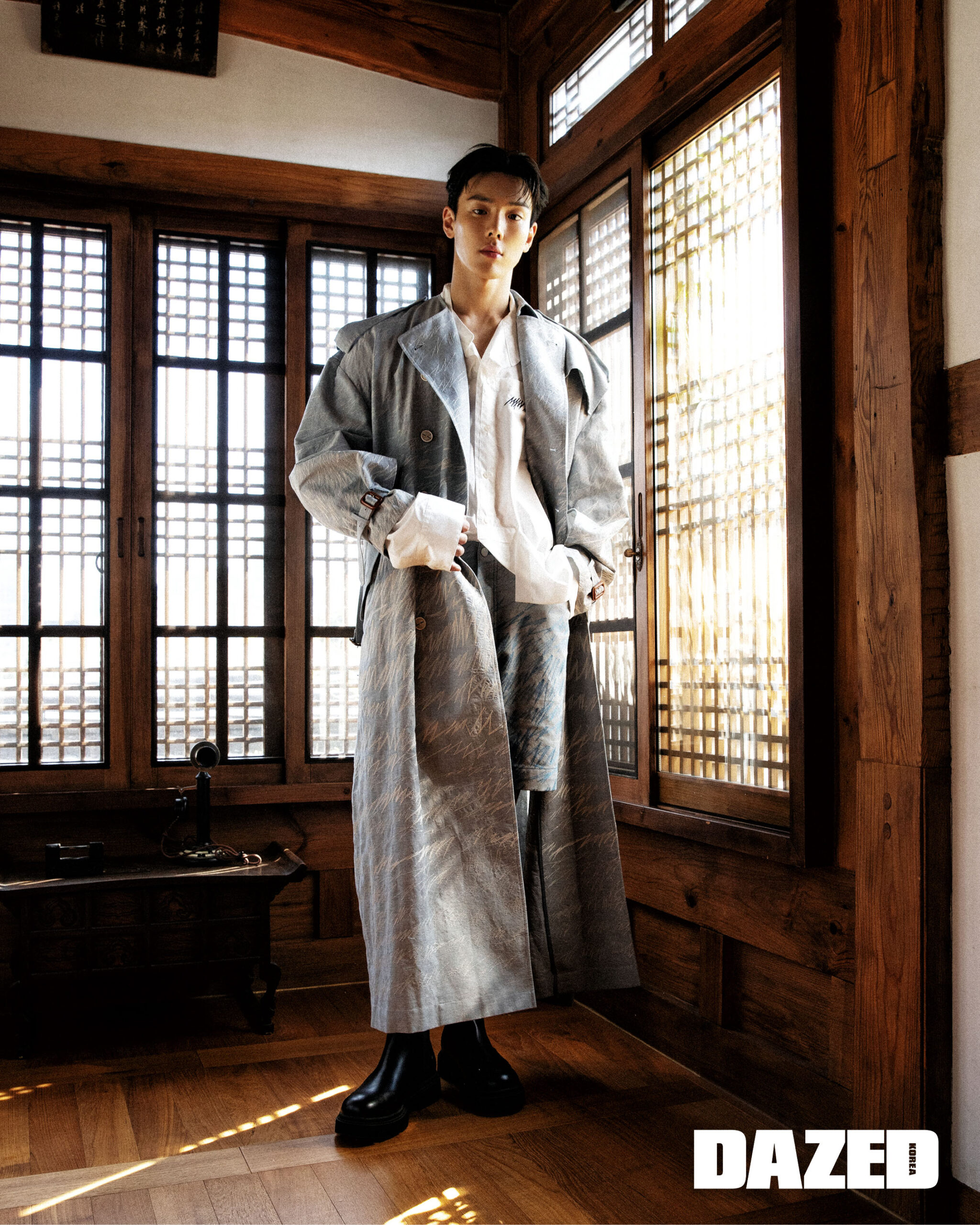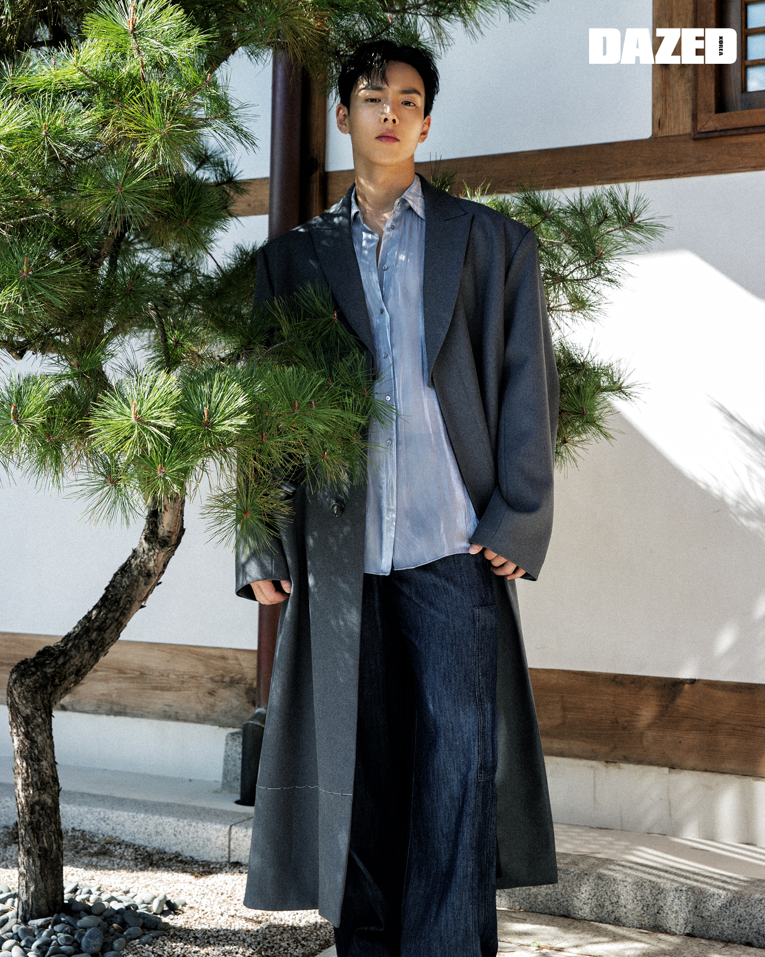 데님 스티치 트렌치코트와 쇼츠 셋업, 로고 디테일 셔츠는 모두 므아므(MMAM).