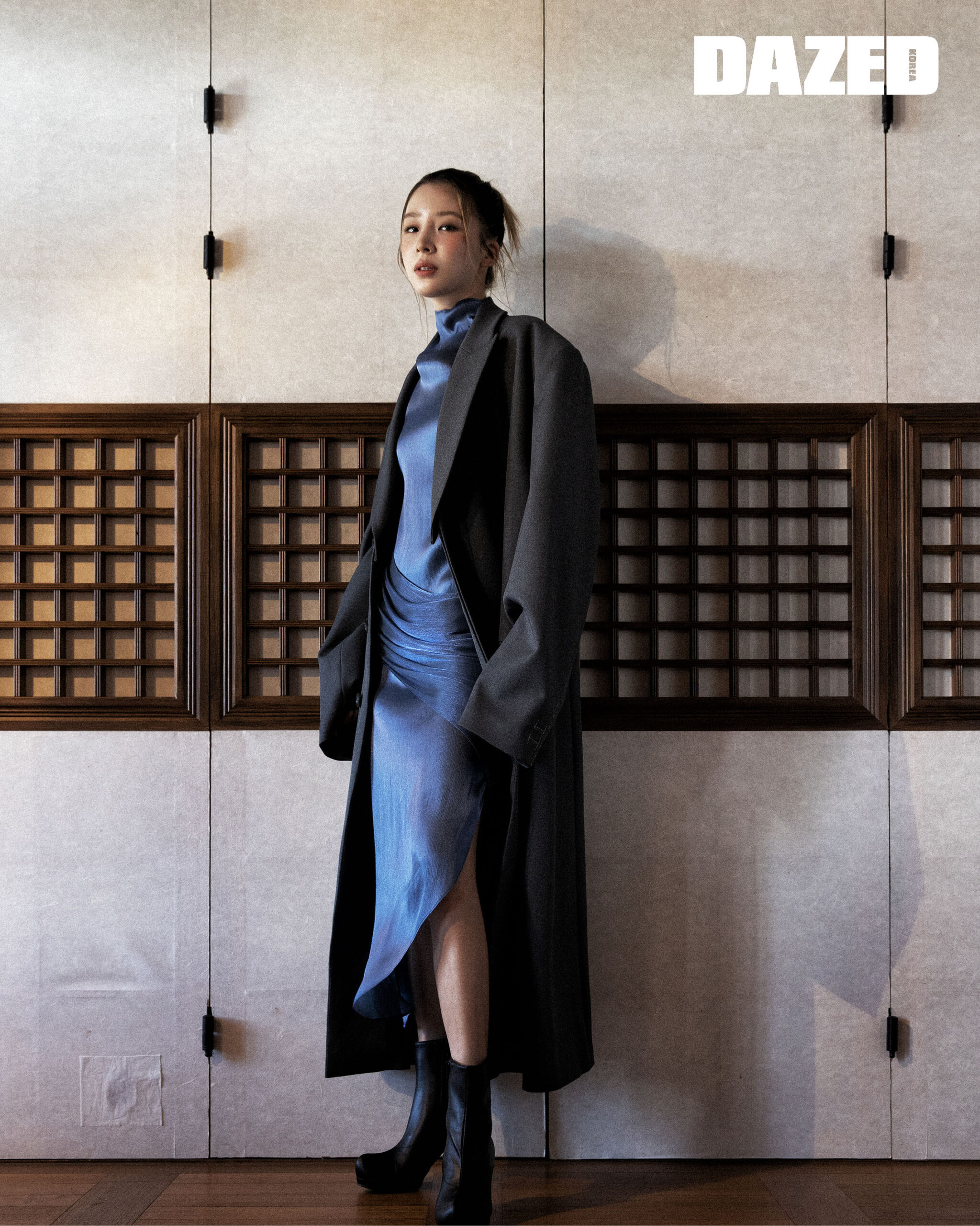 리무버블 칼라 코트와 로열 블루 드레스는 리이(Re Rhee), 앵클부츠는 리이 X 엘노어(Re Rhee X Elnore).