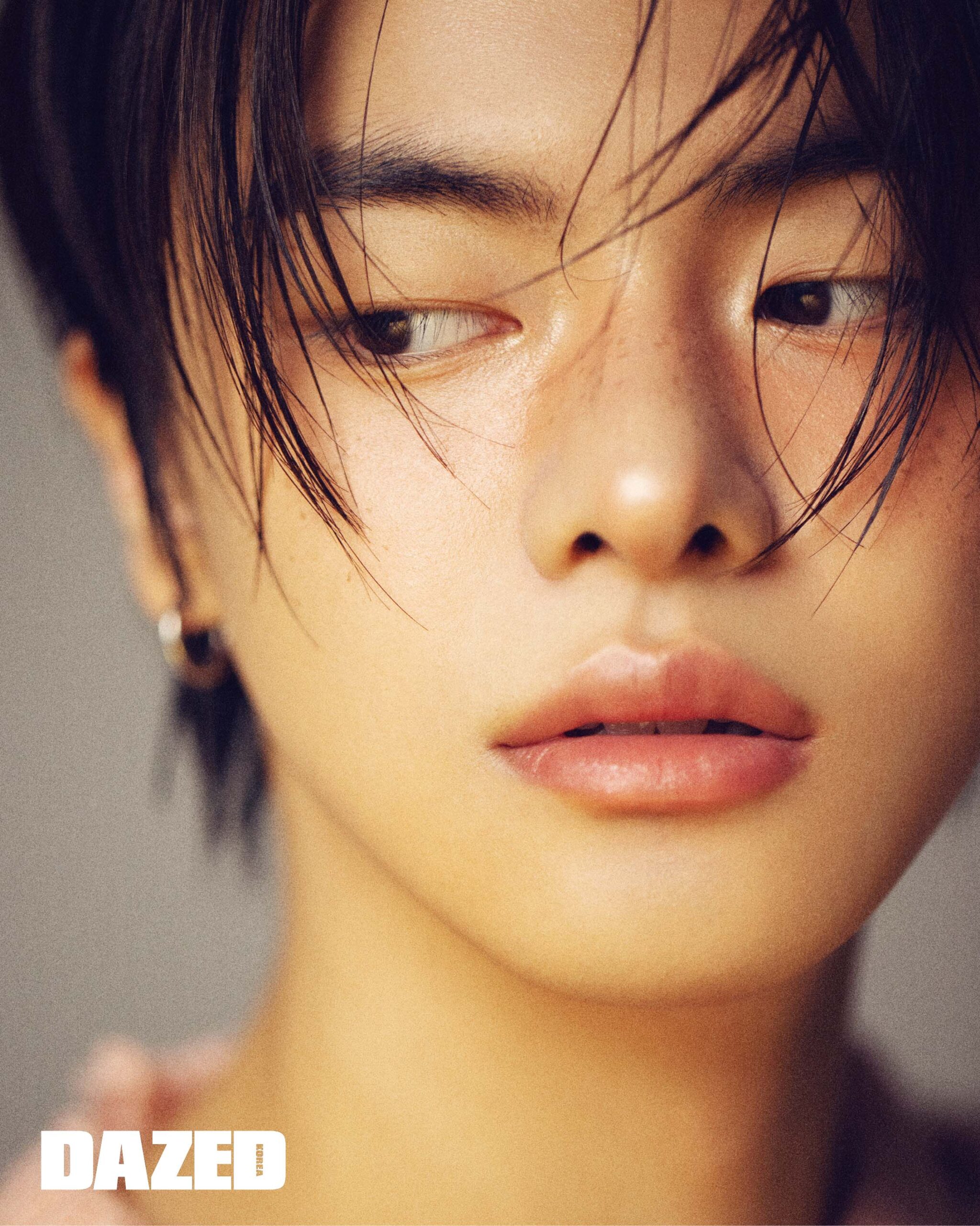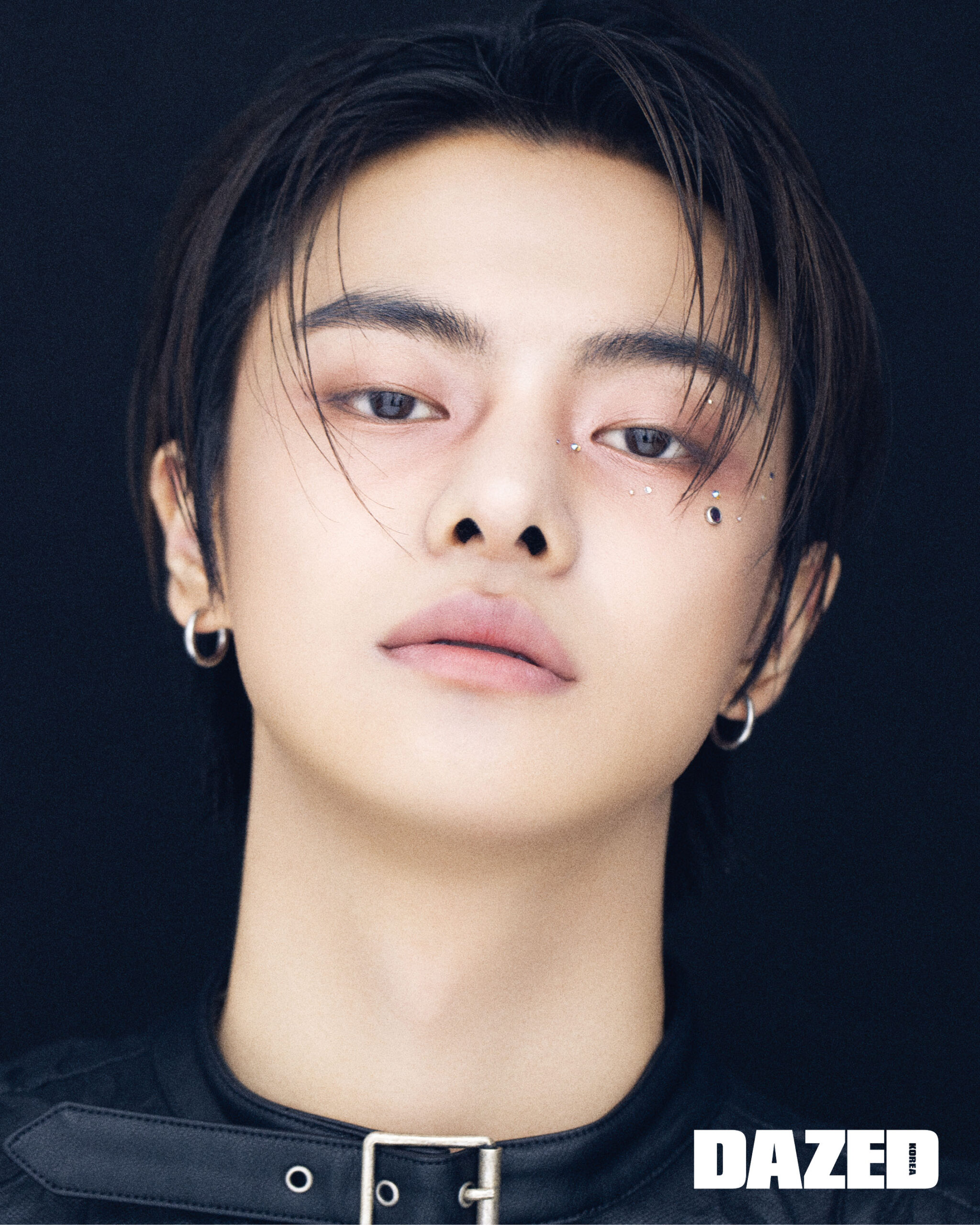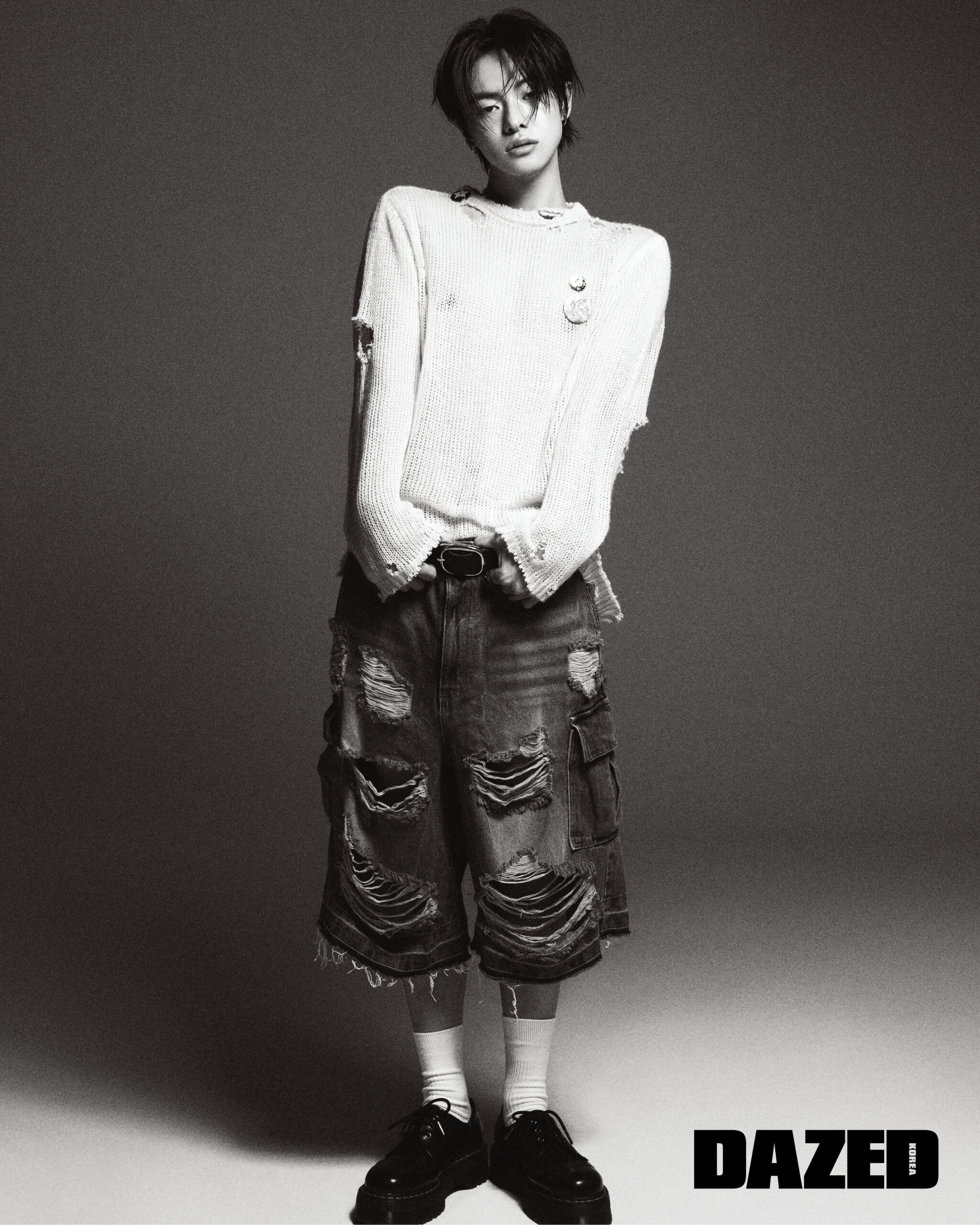 배지 레이어링이 특징인 메시 니트 톱은 조거쉬(Joegush), 디스트로이드 디테일의 와이드 데님 팬츠는 레씨토(Lecyto), 슈즈는 닥터마틴(Dr. Martens), 왼손 검지에 착용한 실버 링은 에스콘디테(Escondite), 벨트와 삭스는 스타일리스트의 것, 이어링은 리오의 것.