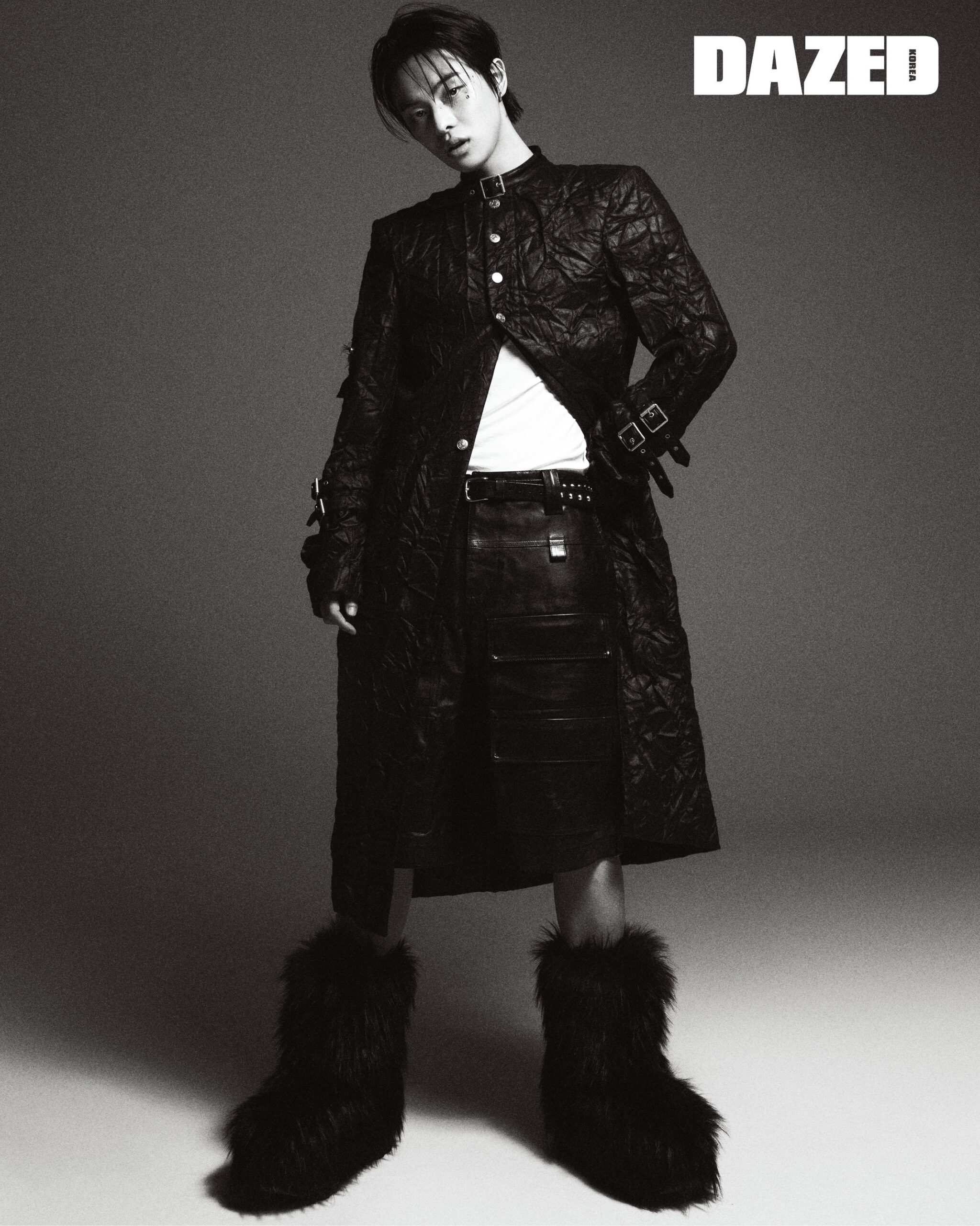 버클 디테일이 돋보이는 레더 코트는 아크네 스튜디오(Acne Studios), 이너 톱은 존 바바토스(John Varvatos), 프런트 포켓이 특징인 레더 소재 카고 쇼츠는 1017 알릭스 9SM(1017 Alyx 9SM), 퍼 부츠는 사카이(Sacai), 벨트는 스타일리스트의 것, 이어링은 리오의 것.