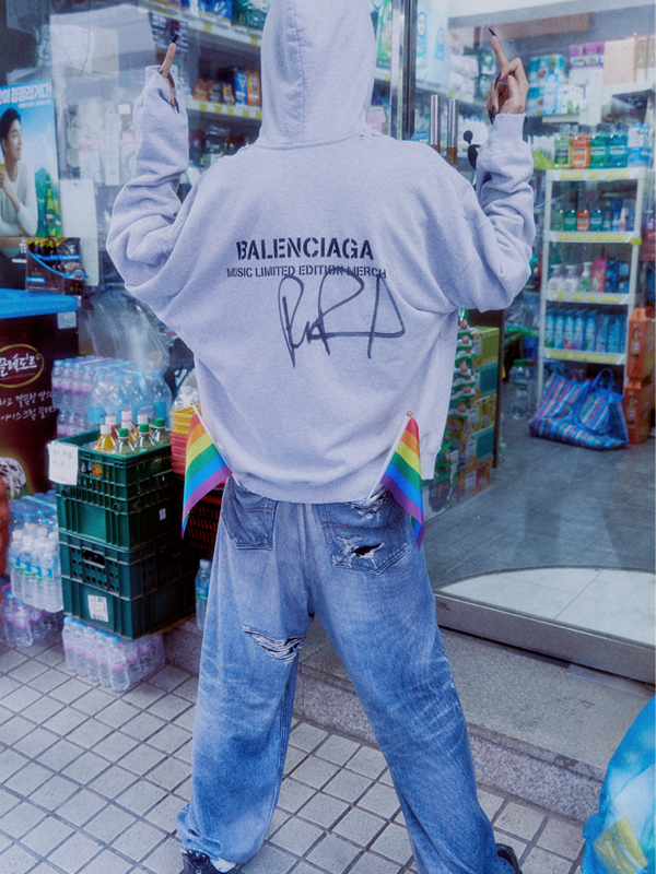 기묘한 드래그 퀸? 호러 소년? 호소가 ‘GAY’와 ‘PRIDE’라고 쓰인 발렌시아가의 겨울 컬렉션을 입고 세상에 던지는 메시지.