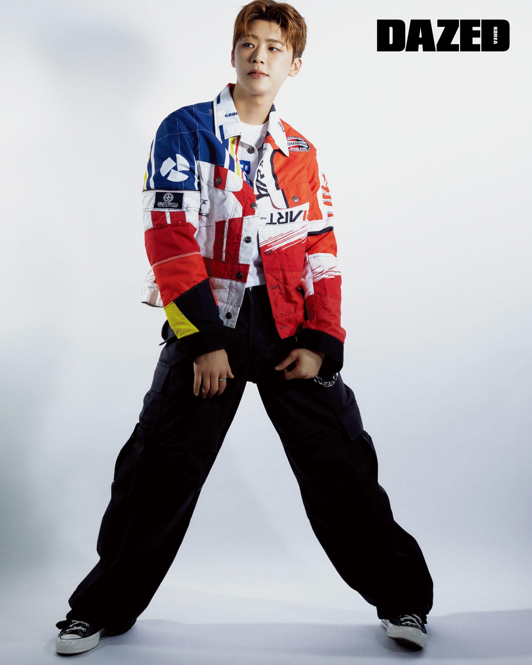 라이더 재킷은 그렉 로렌 by 지스트리트 494 옴므(Greg Lauren by G.Street 494 Homme), 카고 팬츠는 루드 by 지스트리트 494 옴므(Rhude by G.Street 494 Homme), 블랙 스니커즈는 컨버스(Converse), 네크리스와 링은 베르사체(Versace), 팬츠에 달린 체인은 포트레이트 리포트(Portrait Report), 화이트 톱은 스타일리스트의 것.