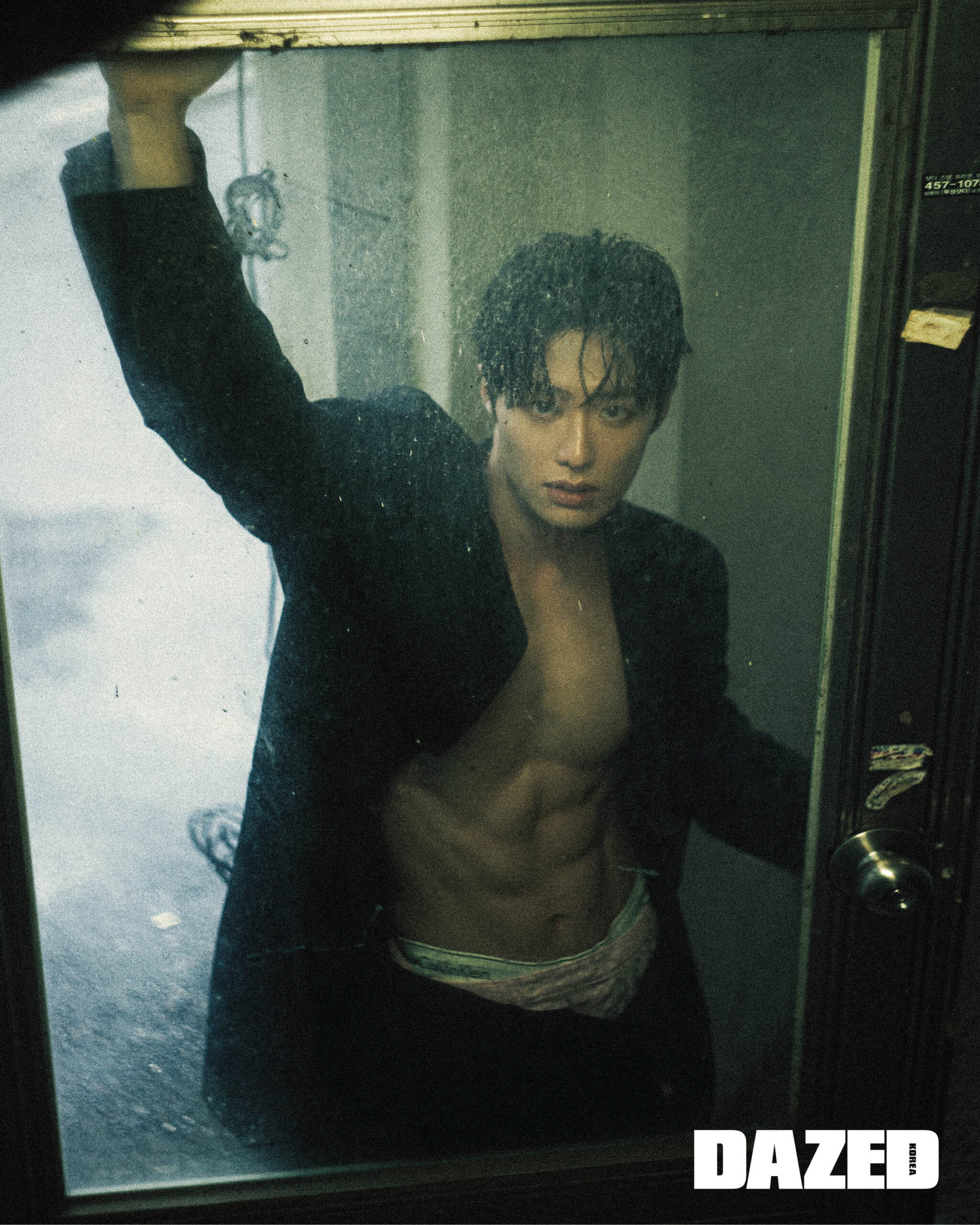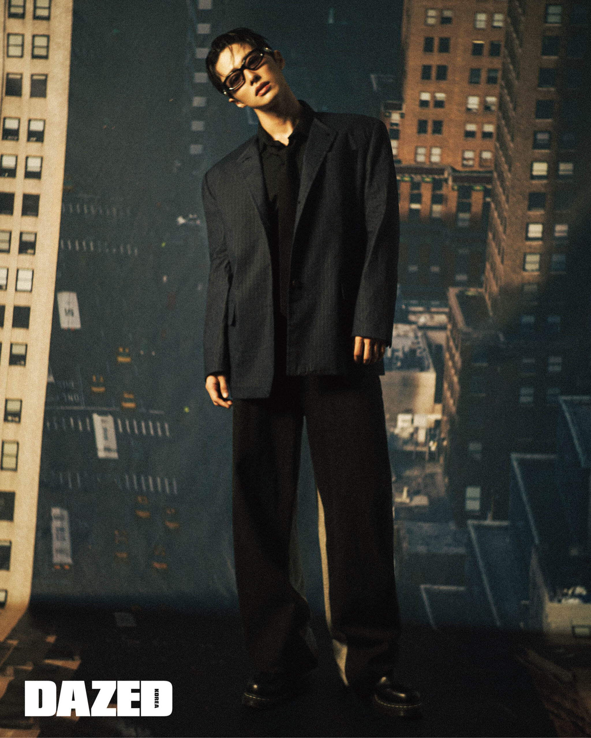 스트라이프 칼라리스 재킷은 준지(Juun.J), 블랙 & 그레이 팬츠는 푸시버튼(PushBUTTON), 부츠는 닥터마틴(Dr. Martens), 선글라스는 젠틀몬스터(Gentle Monster), 셔츠와 타이는 에디터의 것.