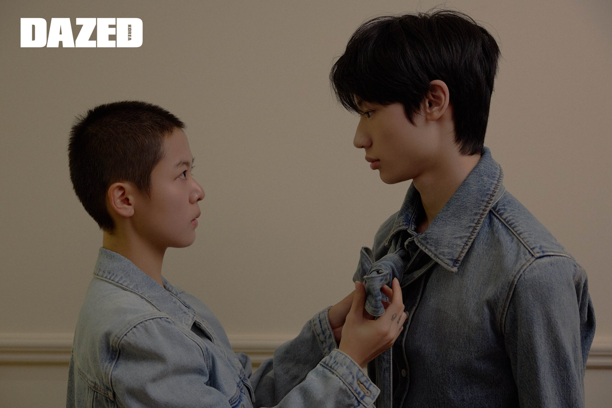 예지가 입은 워시드 데님 재킷은 웰던(We11done). 동리앙이 입은 데님 보 셔츠는 로에베(Loewe).