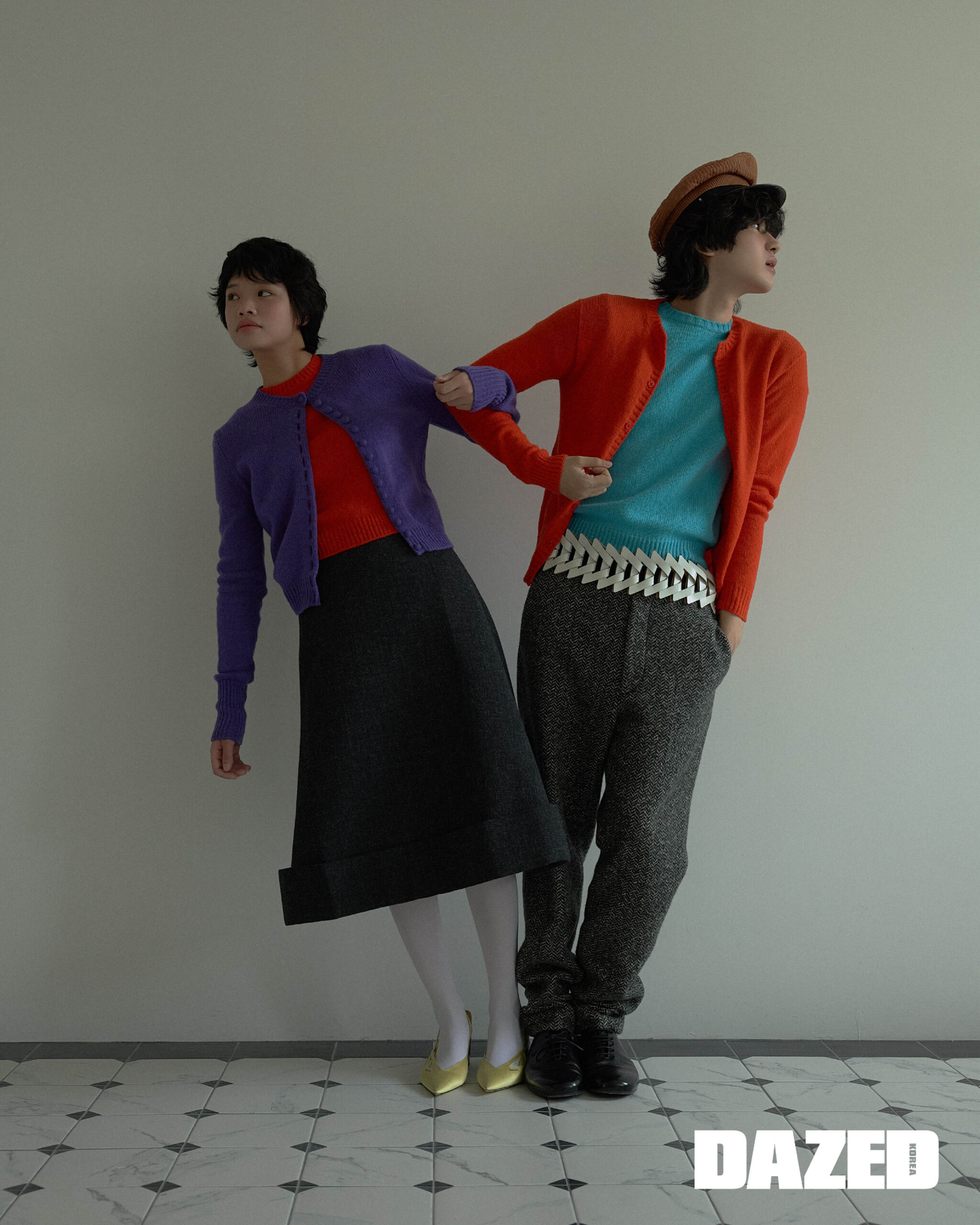 이림이 입은 퍼플 캐시미어 카디건과 레드 캐시미어 니트 톱, 다크 그레이 울 스커트, 레몬 옐로 새틴 컷아웃 펌프스는 모두 프라다(Prada), 타이츠는 에디터의 것. 경준이 입은 레드 캐시미어 카디건과 스카이 블루 캐시미어 톱, 화이트 레더 벨트 디테일의 울 팬츠, 브러시드 레더 레이스업 슈즈, 브라운 컨덕터 해트는 모두 프라다(Prada).
