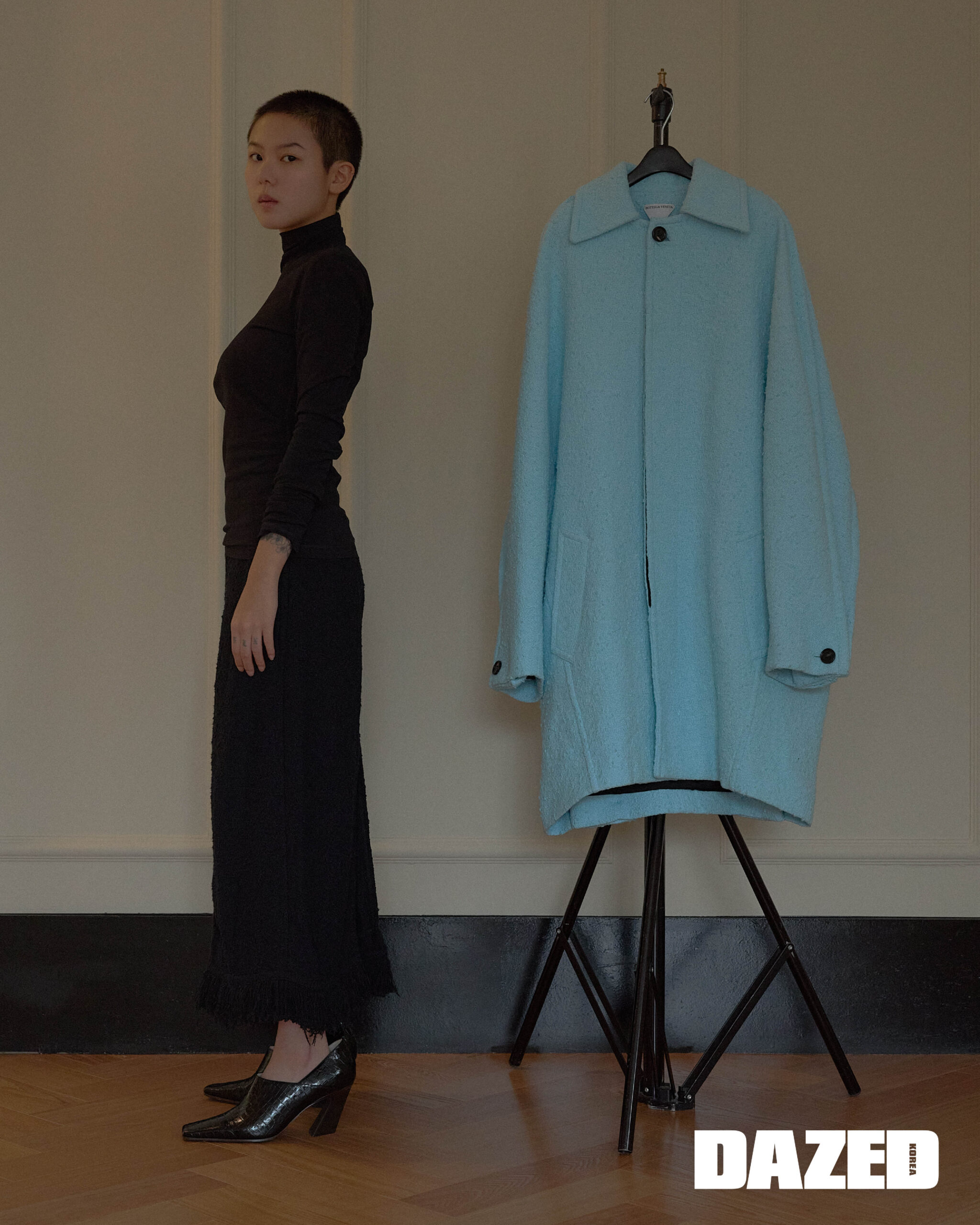 제니스 라이트 코튼 트위드 코쿤 코트와 블랙 터틀넥 톱, 라이트 코튼 트위드 스커트, 루이스 펌프스 힐, 레더 글러브는 모두 보테가 베네타(Bottega Veneta).
