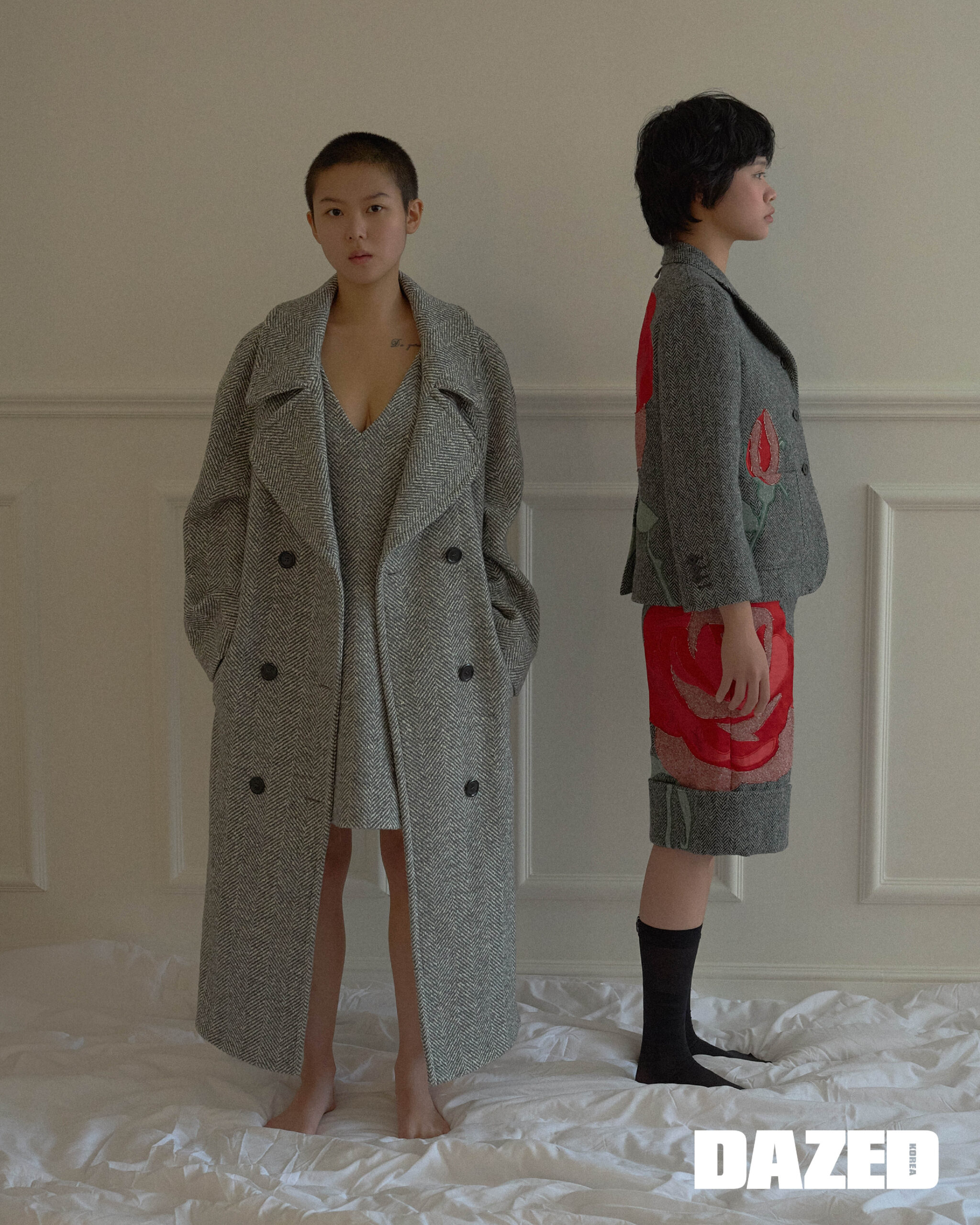 예지가 입은 울 블렌드 헤링본 코트와 드레스는 모스키노(Moschino). 이림이 입은 로즈 엠브로이더리 헤링본 해리스 트위드 블레이저와 버뮤다팬츠, 삭스는 모두 톰브라운(Thom Browne).