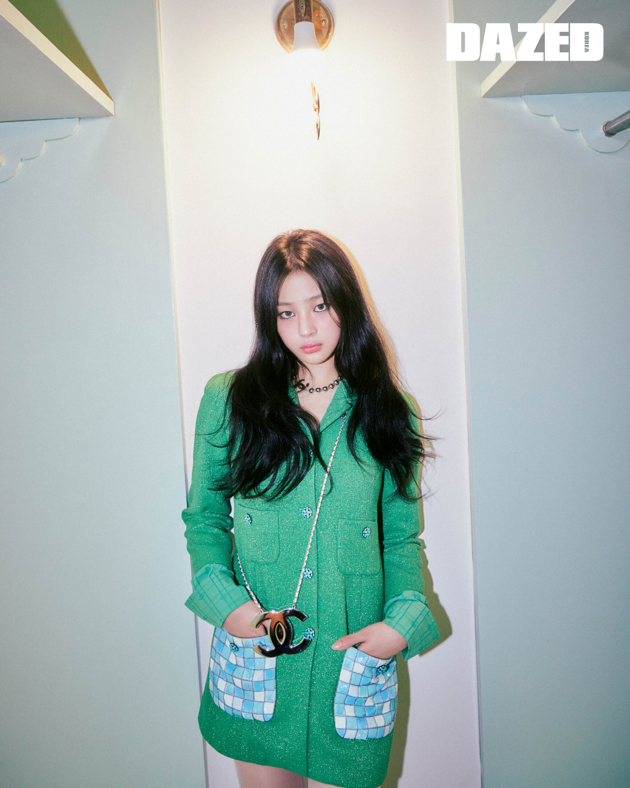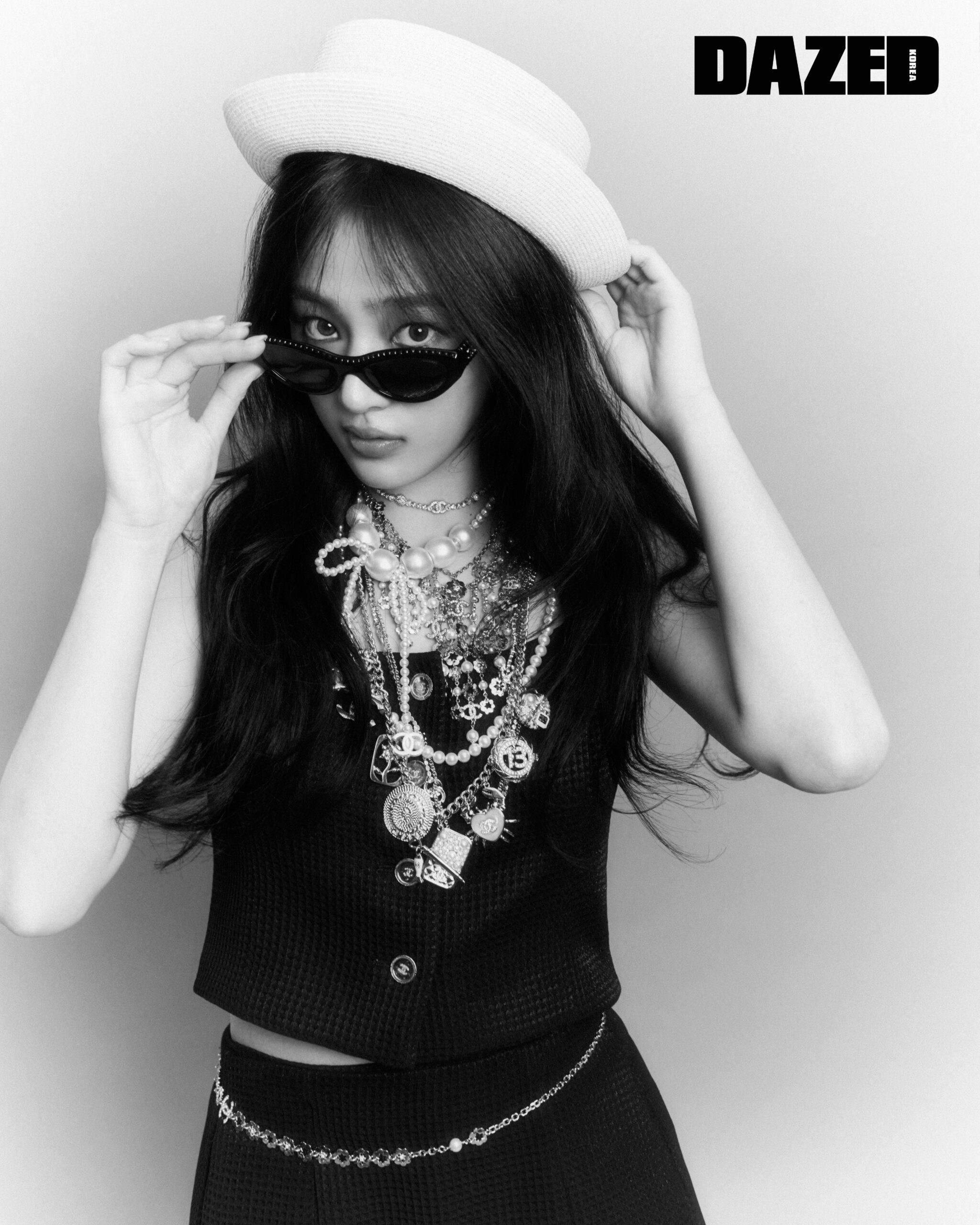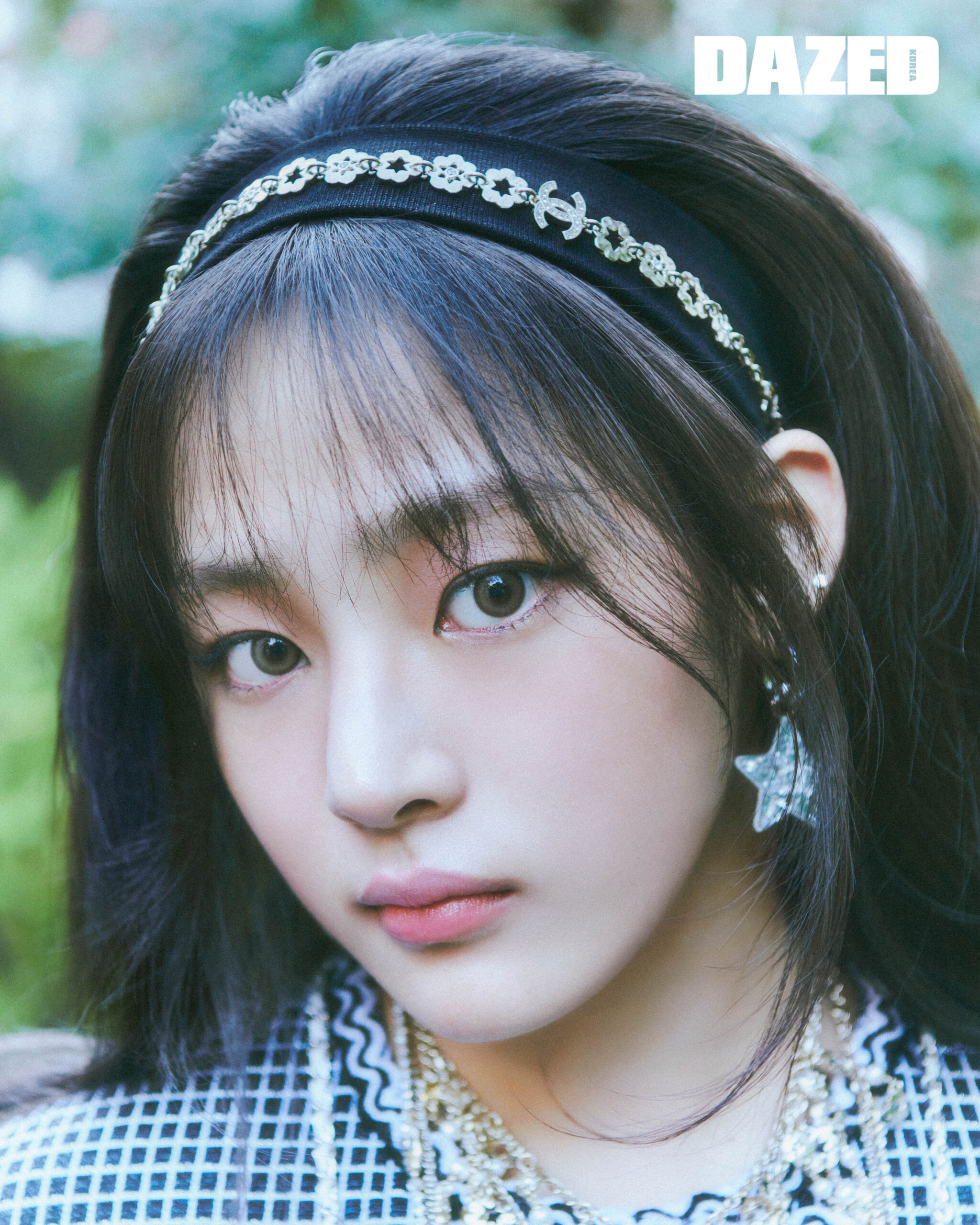 트위드 소재의 배색 라인 디테일 재킷과 헤드밴드로 연출한 플라워 디테일의 참 네크리스, 별 펜던트 디테일의 레진 이어링, 메탈 참 디테일의 골드 네크리스, 메탈 카프스킨 로고 네크리스는 모두 샤넬(Chanel), 코튼 헤드밴드는 스타일리스트의 것.