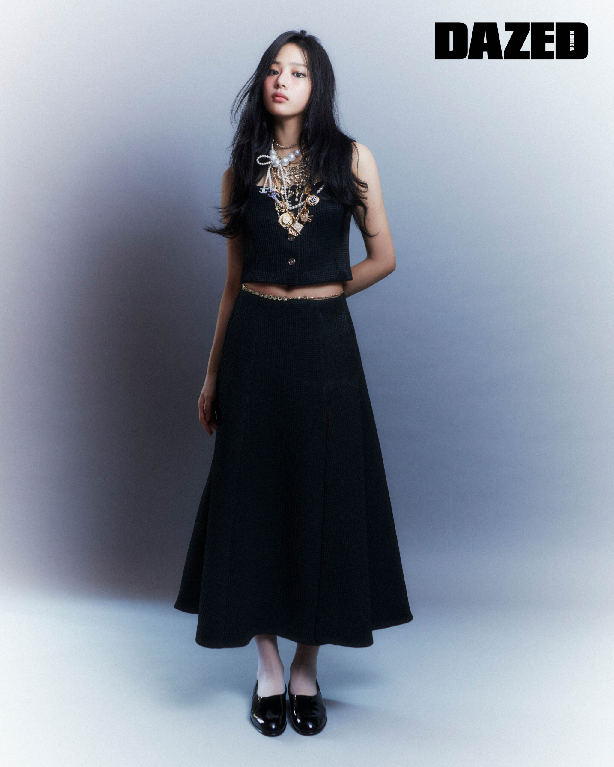 와플 자카드 소재의 슬리브리스 톱과 트임 스커트 셋업, 페이던트 카프스킨 모카신, 미니 참 디테일의 골드 초커, 볼드 글라스 펄 네크리스, 롱 글라스 펄 네크리스, 메탈 참 디테일의 골드 네크리스, 네크리스로 연출한 매탈 레진 참 골드 벨트, 벨트로 연출한 플라워 디테일의 참 네크리스는 모두 샤넬(Chanel), 타이츠는 스타일리스트의 것.