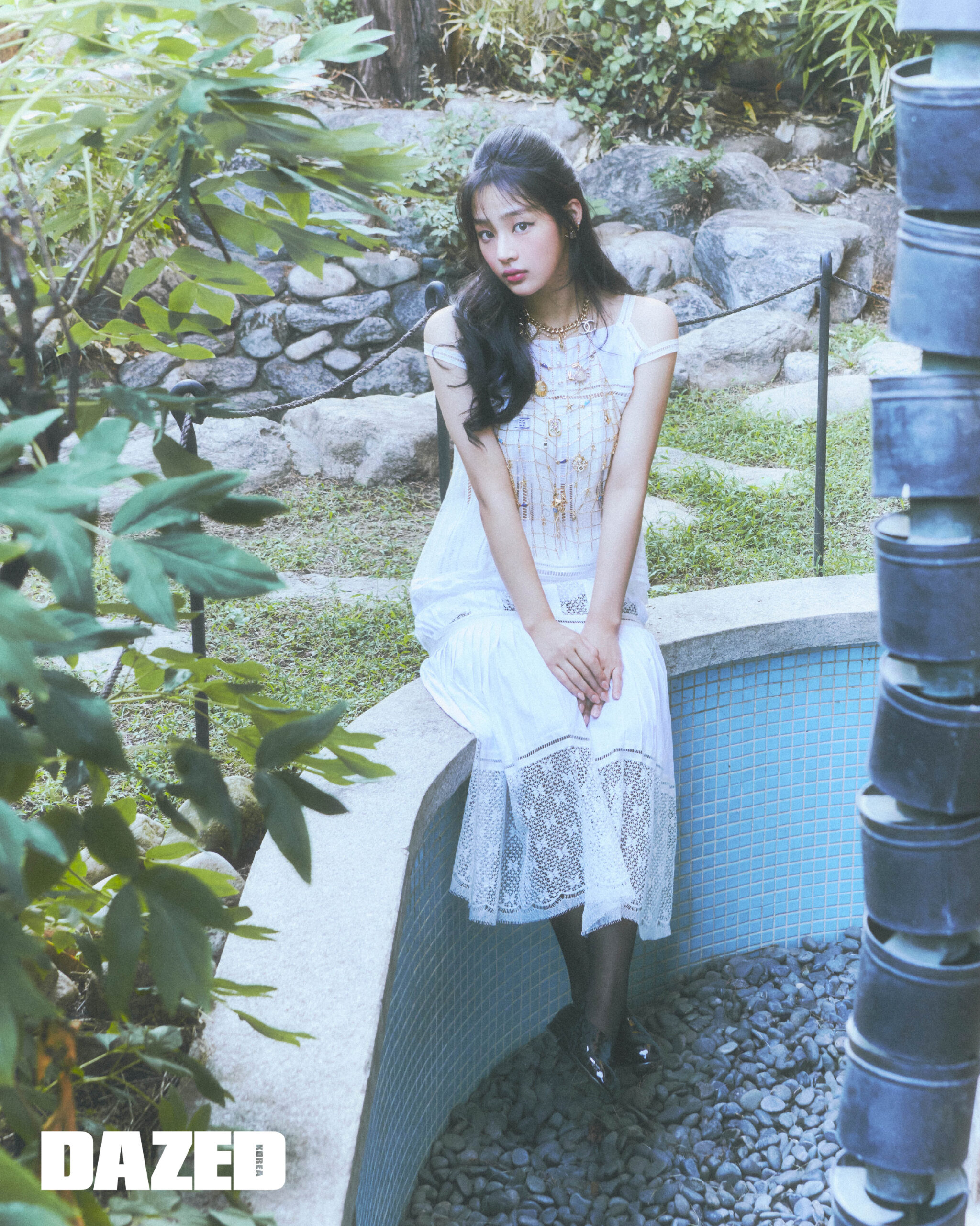 브로더리 앙글레이즈 소재 블라우스와 자카르 포플린 소재 스커트, 스웨이드 고트스킨 그로그랭 슬링백, 메탈 로고 이어링, 메탈 펄 네크리스, 메탈 펄 로고 네크리스, 메탈 펄 롱 네크리스, 글라스 펄 벨트는 모두 샤넬(Chanel), 타이츠는 스타일리스트의 것.