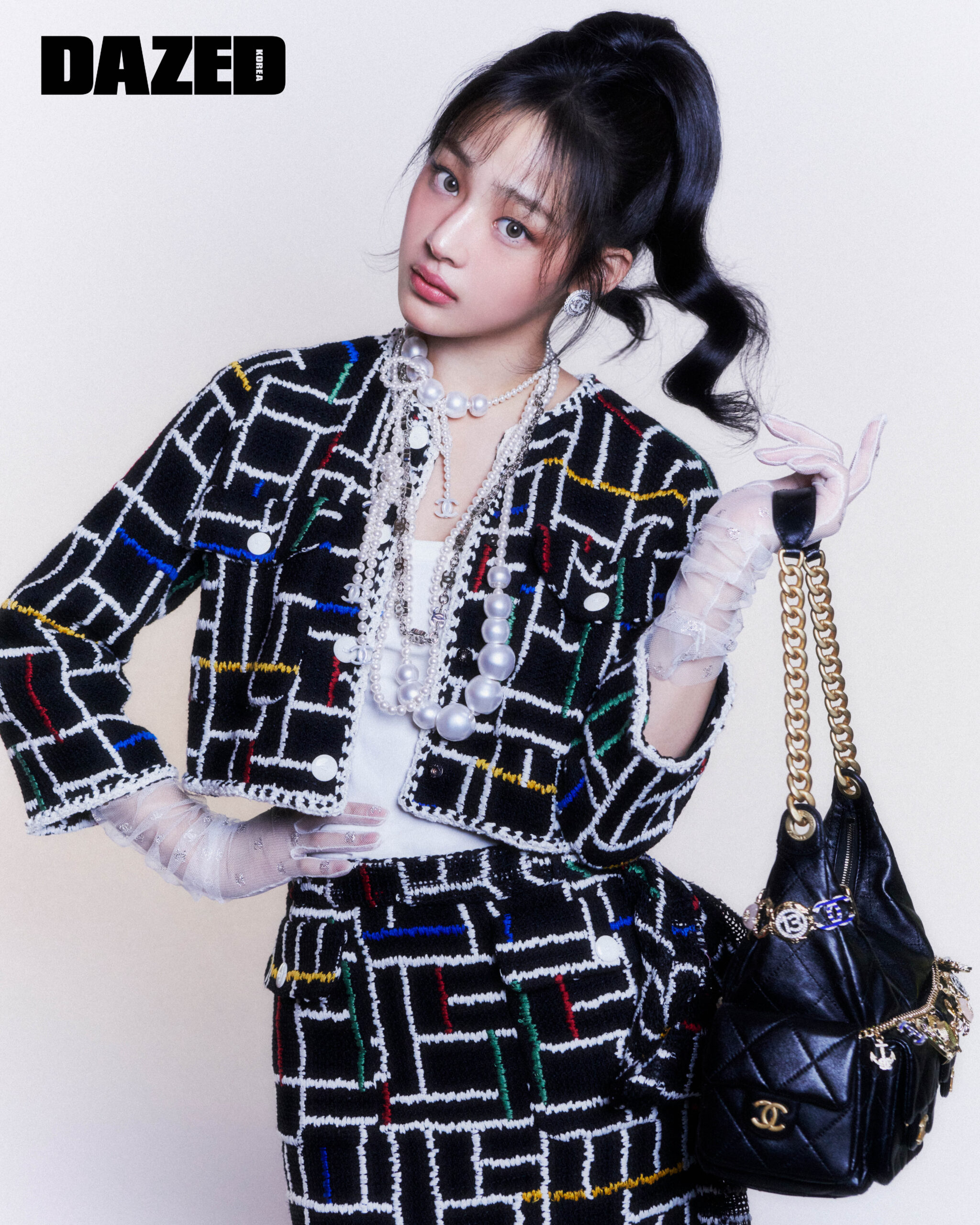 트위드 소재의 컬러 포인트 재킷과 스커트 셋업, 메탈 로고 이어링, 볼드 글라스 펄 네크리스, 메탈 미니 로고 롱 네크리스, 글라스 펄 롱 네크리스, 볼드 글라스 펄 롱 네크리스, 글리터 튤 글러브, 백에 연출한 참 디테일의 골드 브레이슬릿, 백에 연출한 참 디테일의 골드 벨트, 샤이니 램스킨 골드 톤 메탈 호보백은 모두 샤넬(Chanel), 이너 톱은 스타일리스트의 것.